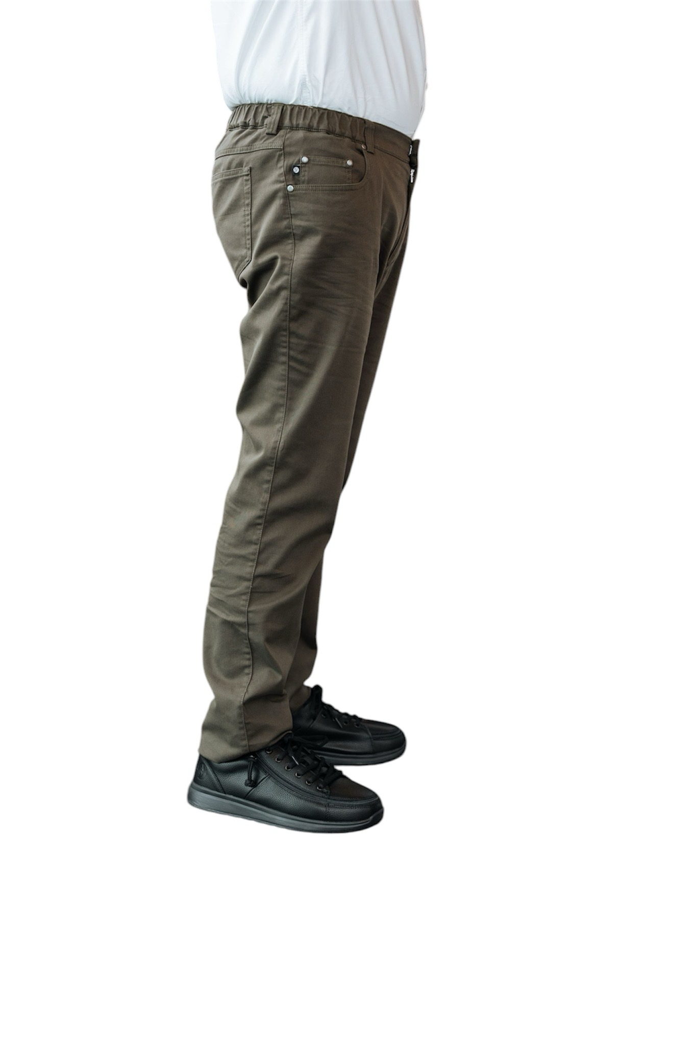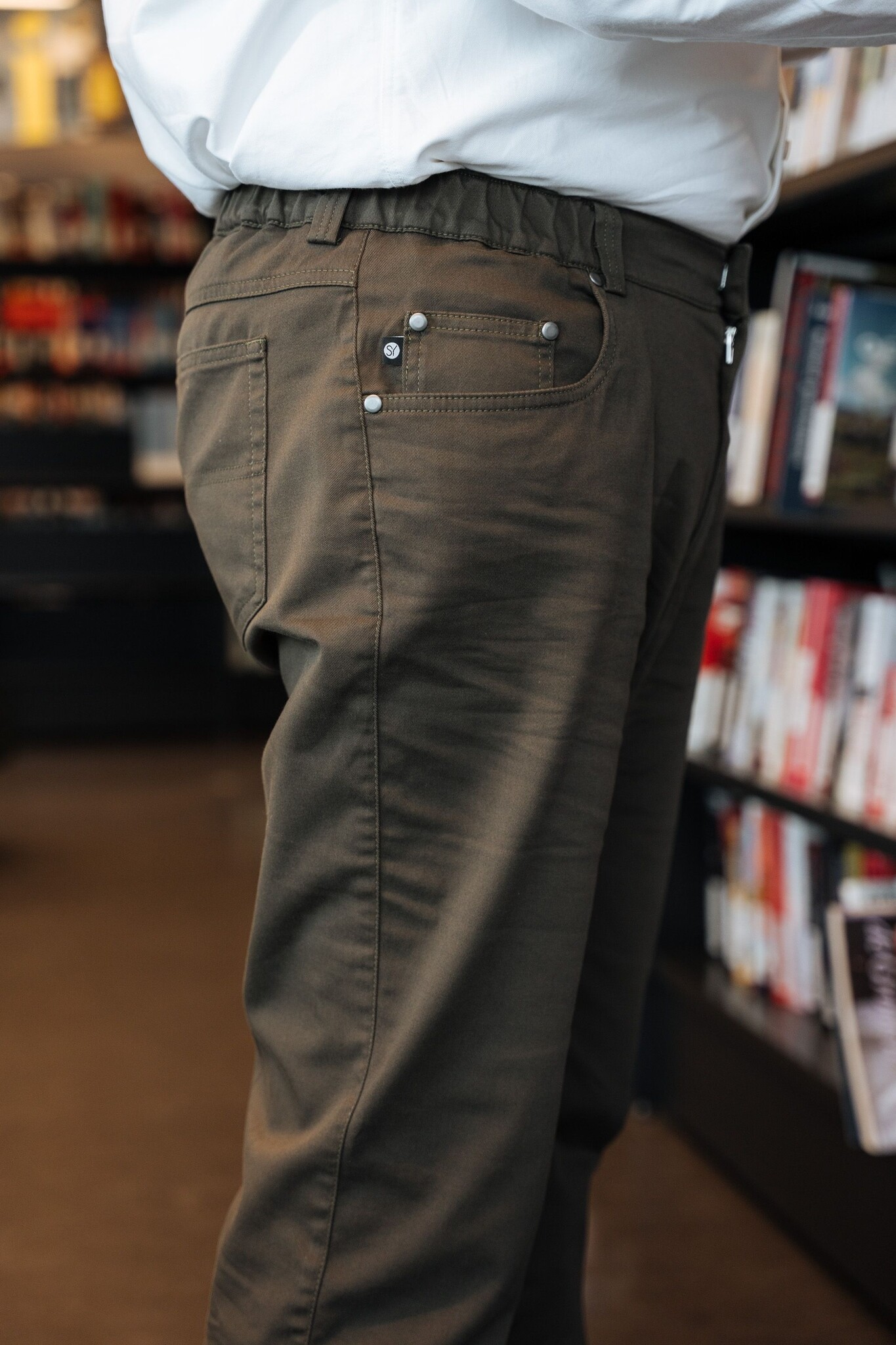 Fashionable 5-pocket trousers in soft cotton with elastic waistband, hook and eye closure and zip. The trousers can be put on without opening the closure, making this model ideal for people with fine motor disabilities or for one-handed use. Thanks to the button and zip, toilet visits can be easy.