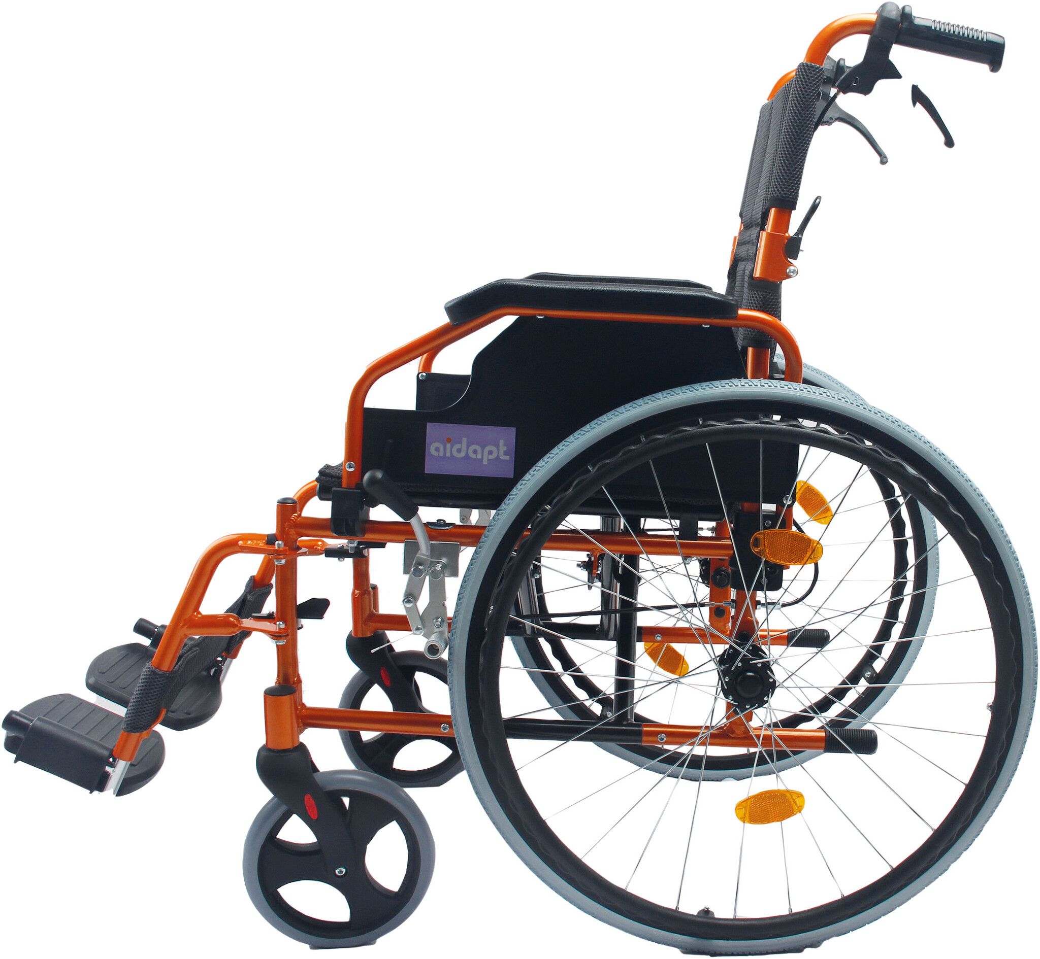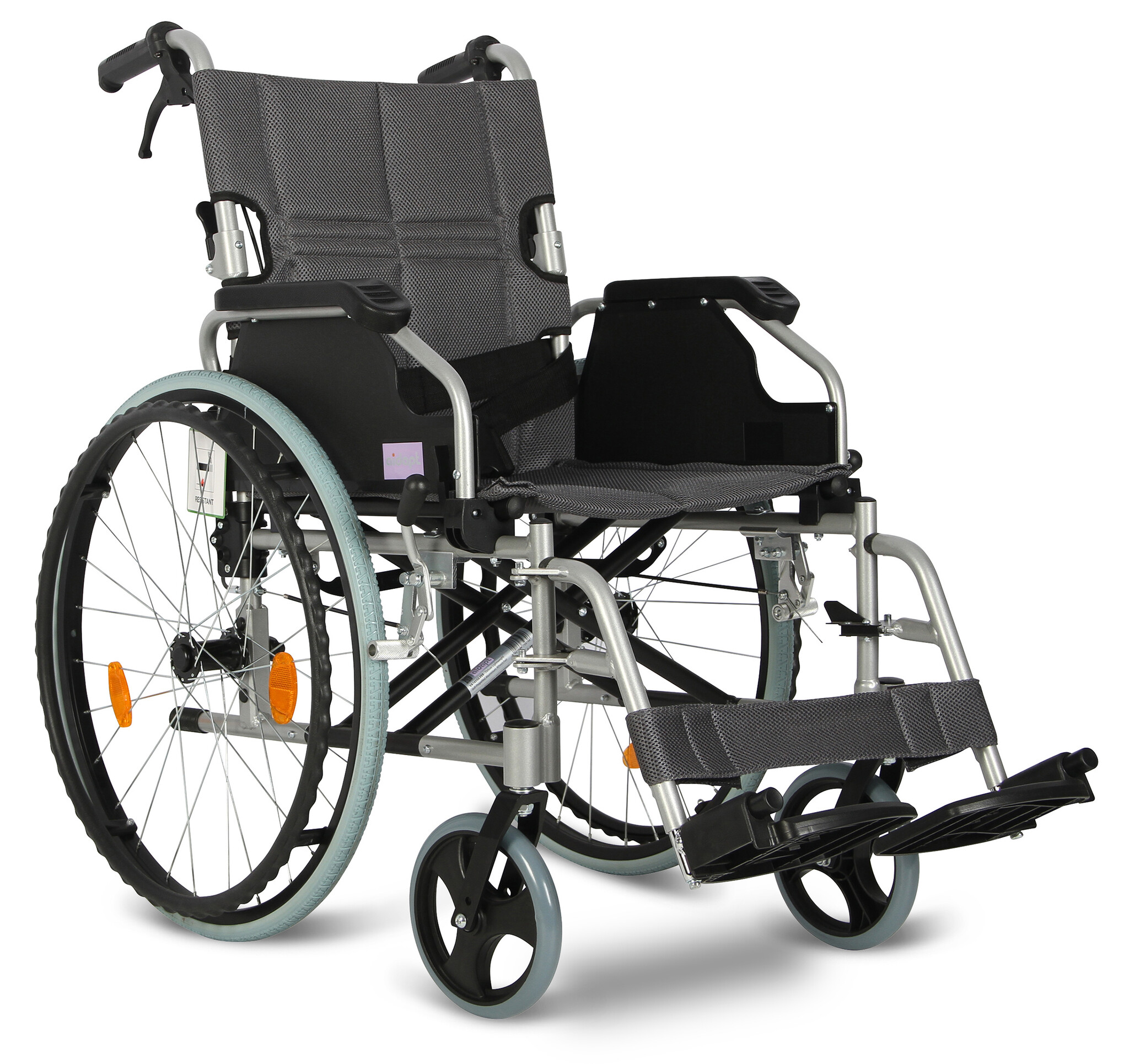 The Deluxe lightweight aluminum wheelchair is ideal for the active, independent user. Features include palm-activated, solid, puncture-proof quick-release rear wheels, luxurious padded upholstery, semi-folding backrest, fold-back armrests, height-adjustable, removable legrests and aluminum brakes. As a safety feature, reflectors have been fitted to the spokes of the rear tires. It is finished with a high-quality paint finish that gives it an extremely modern and attractive look and extends its lifespan.