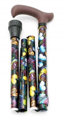 The fantasy folding walking stick is both foldable and height adjustable, making it easy to fit in a bag and facilitating mobility. The stick is equipped with an anti-shock and sound-absorbing ring for extra comfort while walking. The maximum load capacity is 110 kg. Available in various designs, including black, white, flowers and butterflies.