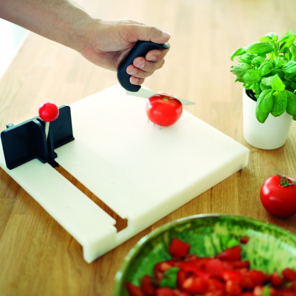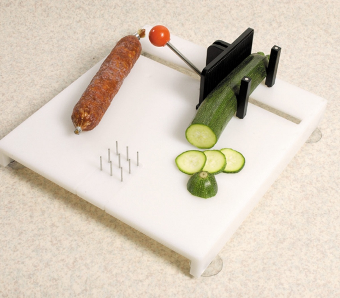 The clamp supports make it easy to hold a bowl, grater or food item in place. The Fixing Board has a special section with 2 cm high stainless steel pins for small food items. When a flat work surface is needed, this section can be removed or attached with the points facing down. Designed for one-handed use. Four suction cups hold the cutting board in place.