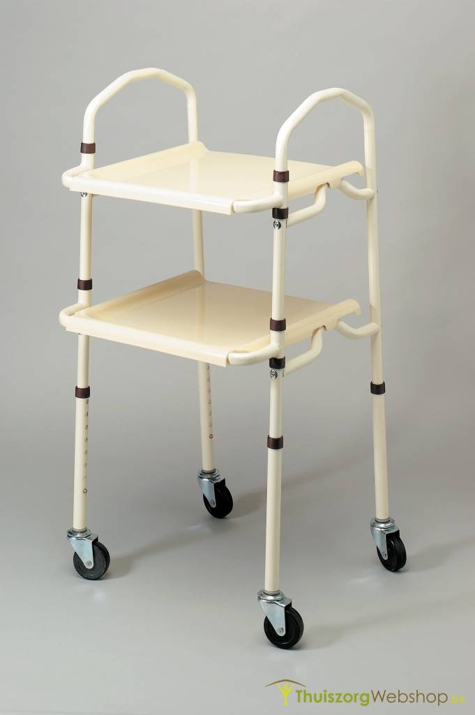 Very sturdy steel trolley with two trays, which can be folded together for transport or for storage.