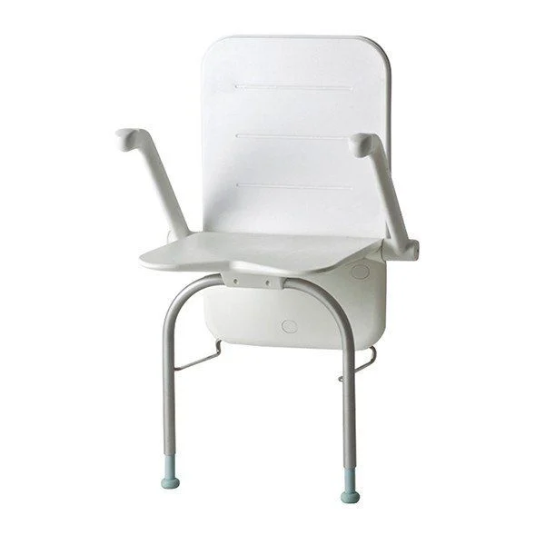 Design shower seat in aluminium/stainless steel and plastic. Equipped with an ergonomic, rounded seat with recess at the front.