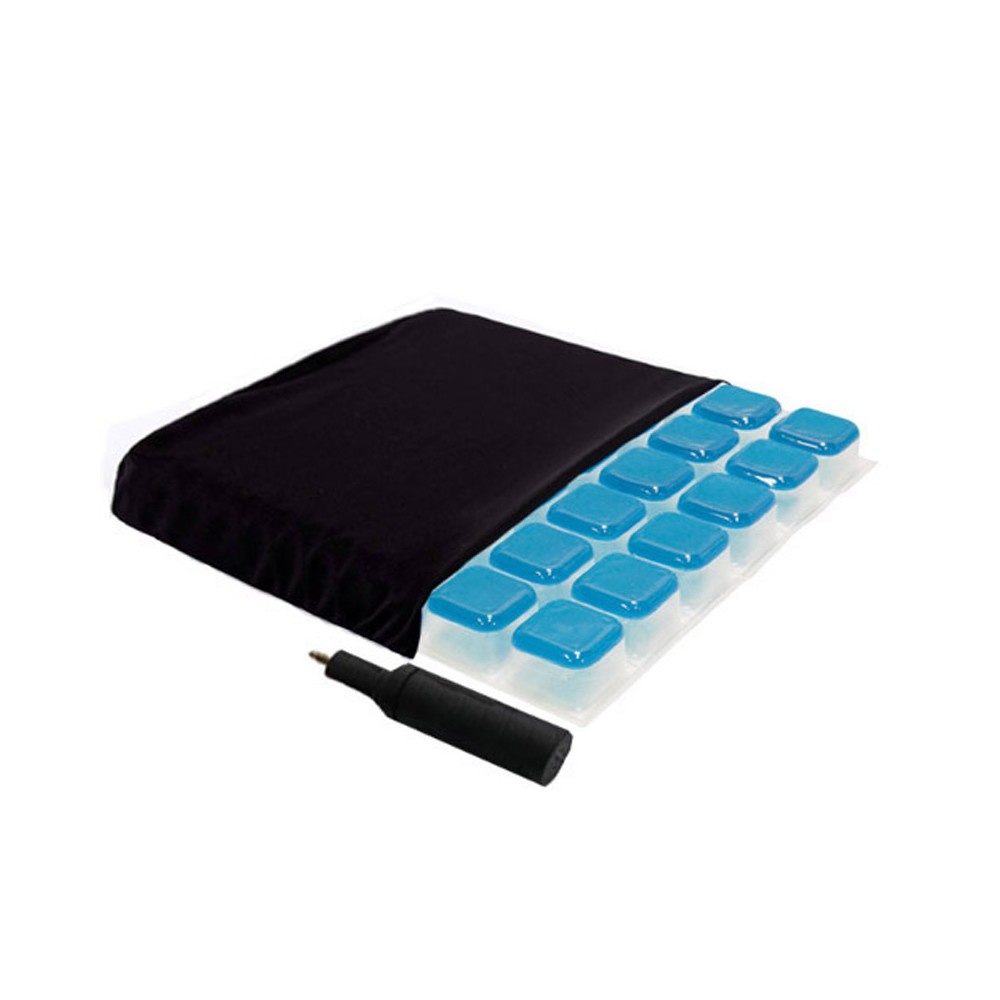 An anti-decubitus seat cushion with Gel Air cells offers excellent pressure distribution and comfort, ideal for people at risk of pressure sores.
