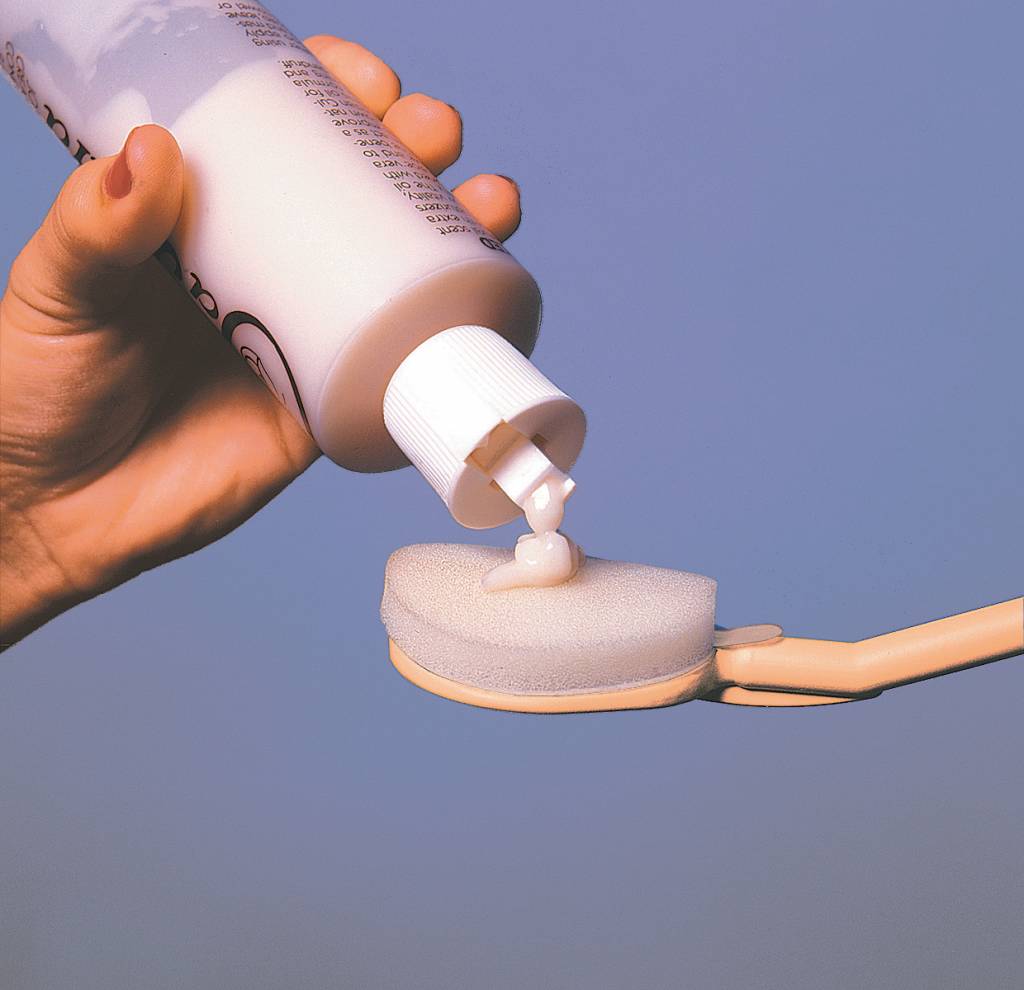 Lotion applicator including sponge with plastic handle. The handle has a recess for the thumb to put more pressure. The sponge is interchangeable.