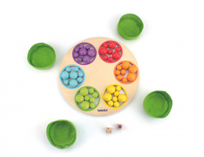All activities can also be played as a communication game, where one child describes the card to the other child, who must follow the instructions and put the balls in the right place. Children can use the activity cards , play the dice game or play freely .