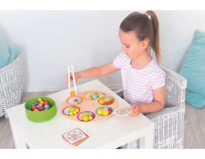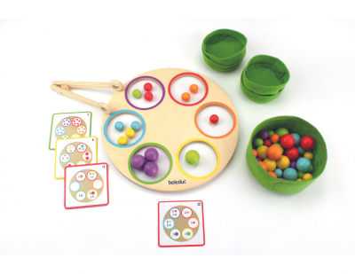 Marbelino is a sorting game where sorting activities are presented on the assignment cards and are based on color, size and quantities each time with 3 different levels of difficulty .