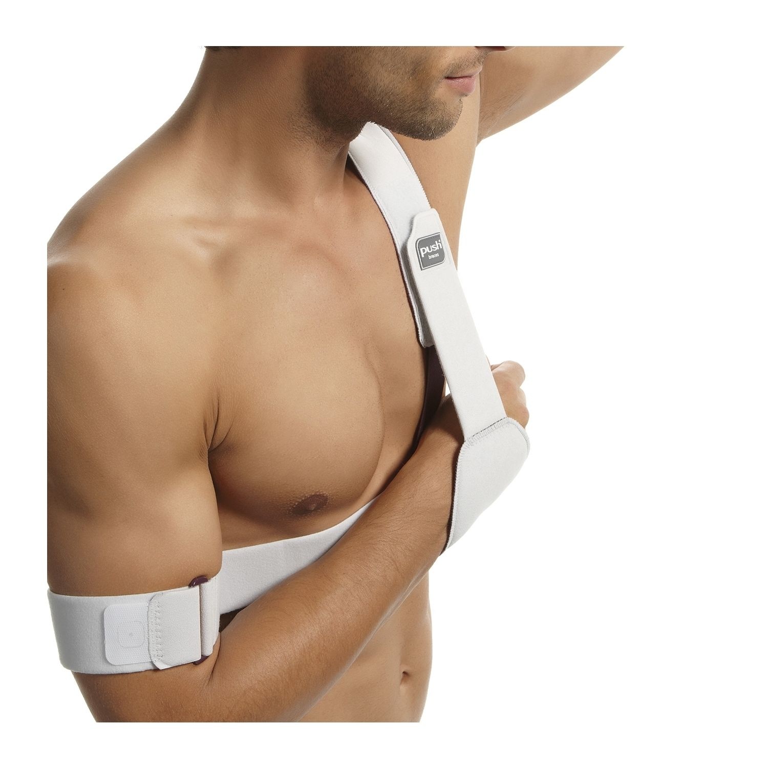 Push shoulder braces provide good immobilization of the shoulder joint, without excessive strain on the neck and shoulders. The Push med Shoulder Brace Plus is equipped with an extra strap over the unaffected shoulder. This band guarantees a fixed position of the forearm by providing comfortable support for the hand and wrist. This can be adjusted in height to prevent possible engorgement (including lymphedema). The weight of the arm is comfortably distributed over the chest and shoulder strap. The 3 sizes of Push med Shoulder Brace Plus offer a wide size range and are available in a left and a right version. Sympress™ Technology The brace is made of Sympress™, a high-quality, comfortable material. The product feels soft and offers the user a comfortable and protected feeling. The Push med Shoulder Brace Plus is easy to apply and can be washed without any problems. INDICATIONS