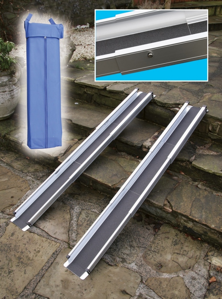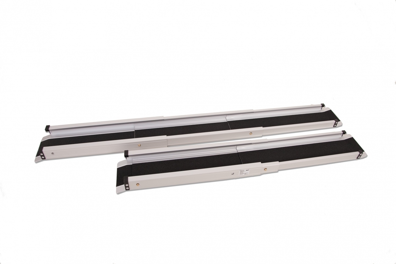 These two retractable ramps are specially designed to be easy to take with you. Made of lightweight anodized aluminum. Including storage bag. The raised edges (height 5 cm) on both sides of the ramp ensure that the wheelchair or scooter user cannot fall from the ramp.