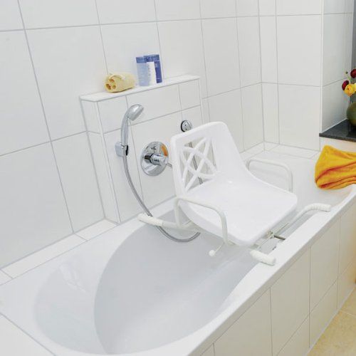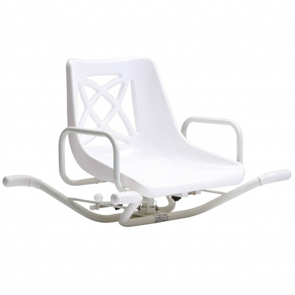 The swivel bath seat has a lightweight aluminum frame that is corrosion resistant and has an easy-to-clean white powder coating. The high-quality swivel bath seat fits quickly and easily over the bath, allowing the user to get in and out of the bath easily and comfortably and improve safety by reducing the risk of slips and falls. The swivel bath seat fully rotates 360 degrees and can be locked at any 90 degree interval for added user safety. The bath chair itself, which is comfortably shaped and features a number of drainage holes for improved user comfort, is equipped with armrests for extra support for the user.