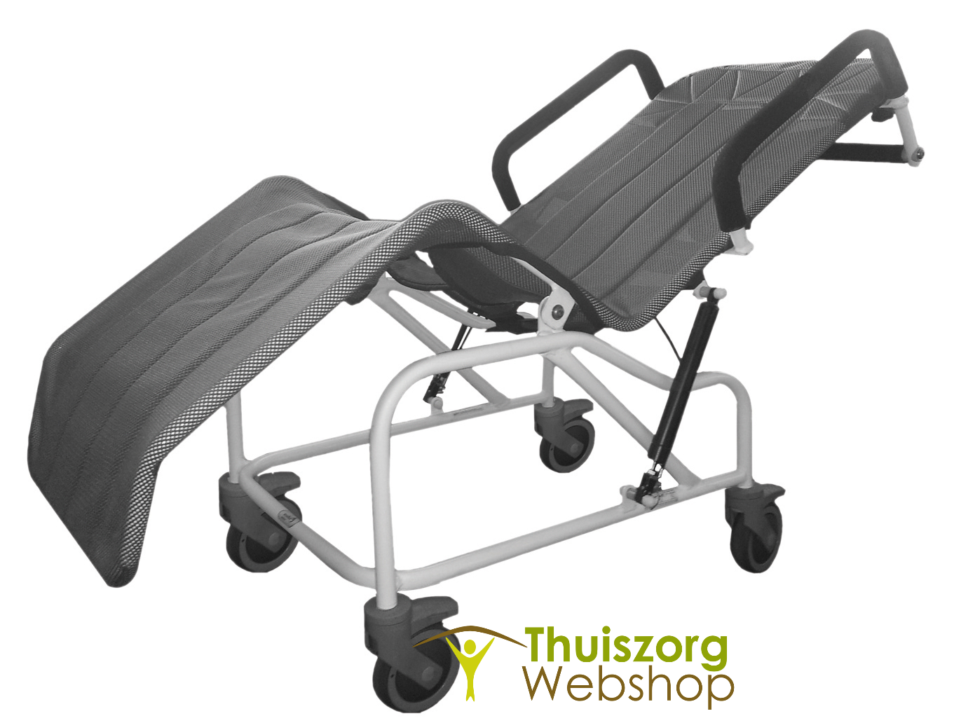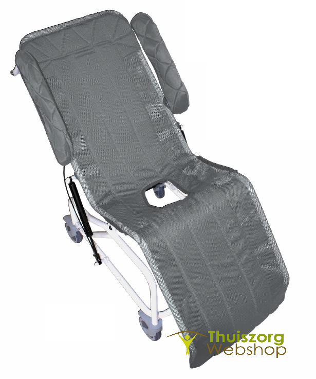 There is also a tilting version of the shower / bath chair. The tilting shower / bath chair is specially designed for users with multiple sclerosis, cerebral palsy, motor neuron disease and clients with fixed hips, legs or contractures. It is also particularly beneficial for those with involuntary movements and rapidly deteriorating body conditions. This level of support has now been combined with the benefits of a tilting shower chair that provides a comfortable and safe bathing solution with a lying surface between 5 and 35 degrees. The shower chair is available in three standard sizes; small, medium and large. Each model is complemented by a carefully designed range of padding and support options that can be combined to create a user-specific support system that offers both comfort and safety. The detachable fabric not only allows for hygienic washing , but the simple design of the buckles also makes the fabric easy to adjust, creating a hammock that can support the user as needed. An opening can be made in the fabric to aid bathing. Side rails are available as an accessory to provide extra safety where needed, which can be combined with a range of hip straps, harnesses, head and chest support pads. The corrosion resistant stainless steel frame is coated with a durable white polyester with an anti-microbial additive for protection.