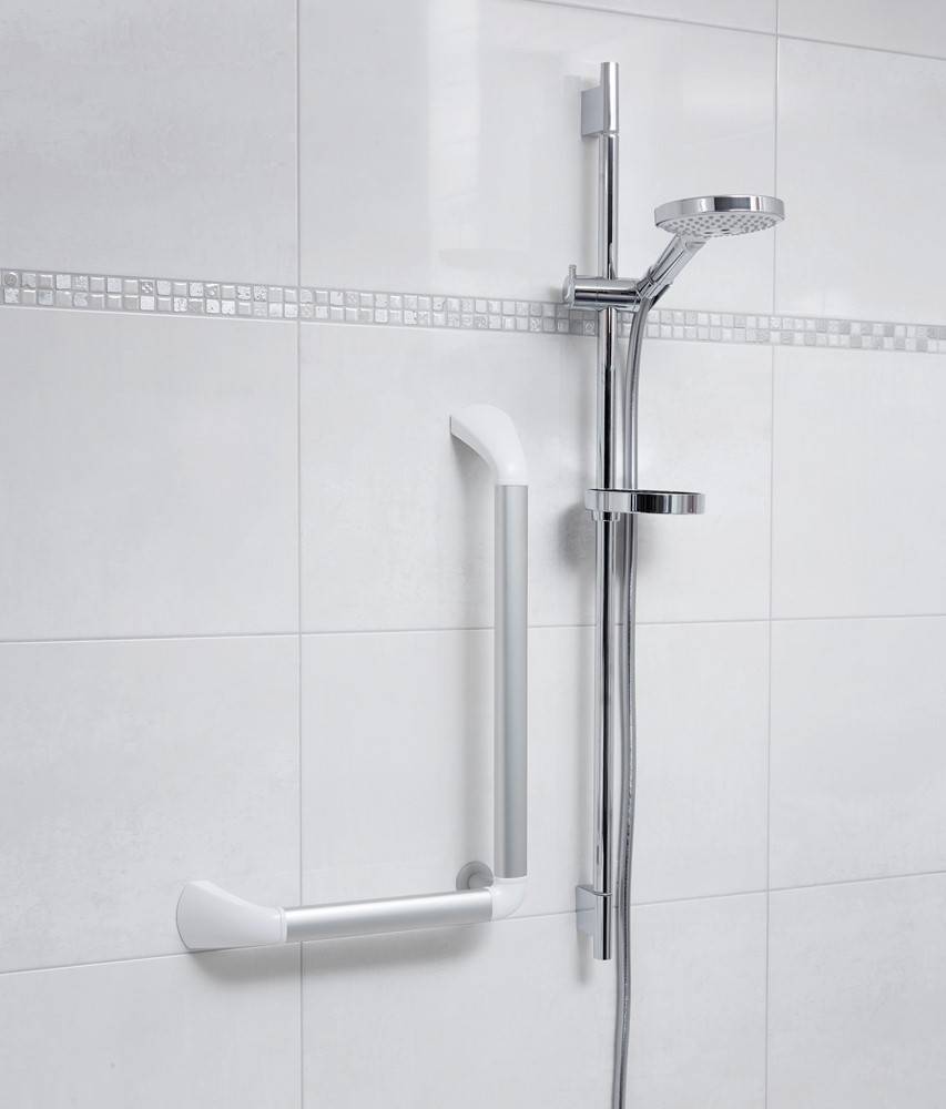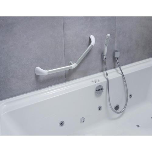 Support mural ergonomique ovale en aluminium anodisé, adapté à une utilisation intérieure et extérieure. Livré en longueurs standard, mais peut également être facilement raccourci. Les supports de montage sont en plastique renforcé, les capuchons en ABS. Comprend des vis et des chevilles en acier inoxydable. Les chevilles Fischer sont recommandées pour le montage sur murs creux. Les supports muraux d'angle peuvent être placés à gauche ou à droite. La prise diagonale permet de se tenir debout, la prise horizontale permet de se relever d'une position assise.