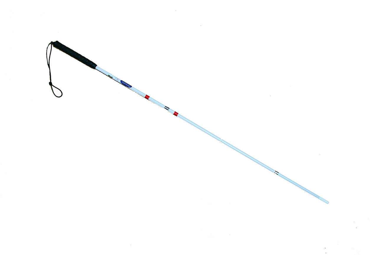 Cette canne est fabriquée en aluminium et pliable en5 parties. Equipé d'une bande réfléchissante blanche et de 2 bandes réfléchissantes rouges. Point exclusif. La pointe est fixée au moyen d'un crochet.