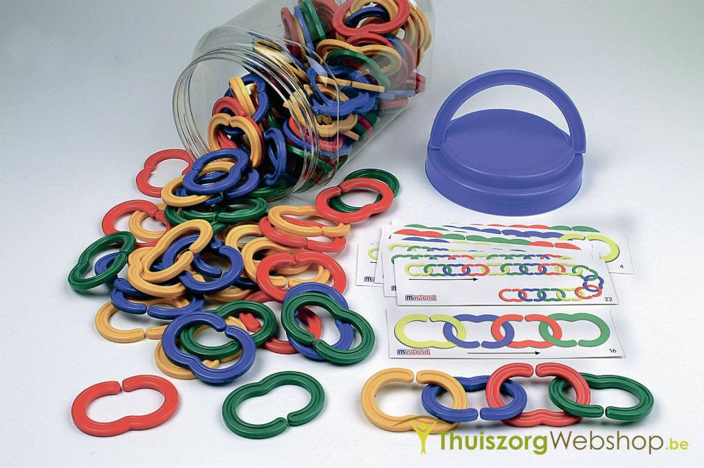Les maillons mesurent 6,5 cm et se tiennent donc bien en main. A l'extrémité de chaque maillon, une petite ouverture qui permet de les emboîter facilement ou de les ouvrir. On opte pour une chaîne bariolée ou unicolore. Jeu exerçant la fine motricité.