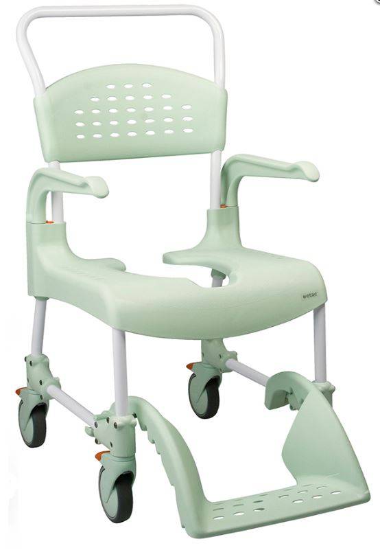Le fauteuil roulant WC et douche Etac Clean est particulièrement maniable grâce au design gracieux et à la forme des poignées. Le Clean s'adapte également parfaitement aux cuvettes de toilettes debout et suspendues.