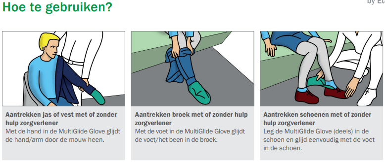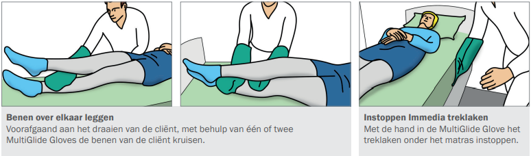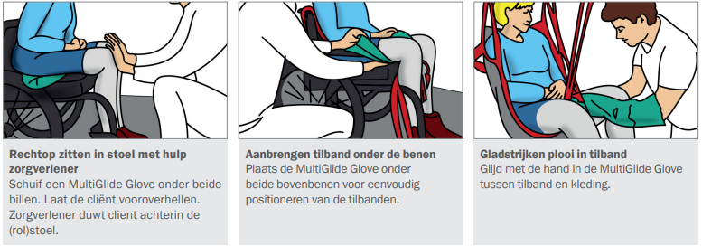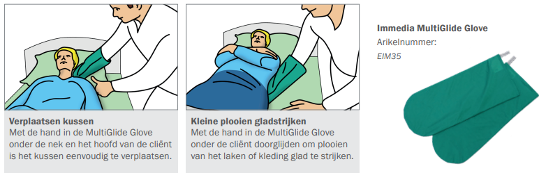 Si l'utilisateur doit être positionné plus haut dans le lit, deux soignants (chacun portant un gant MultiGlide sur la main la plus proche du lit) glissent la main avec le gant MultiGlide sous les omoplates de l'utilisateur. Ensuite, en se tenant debout avec un pied en avant et en utilisant une écharpe ou un OneManSling sous les hanches/le dos de l'utilisateur, les soignants peuvent élever l'utilisateur (par transfert de poids uniquement). Le gant MultiGlide peut également être utilisé lorsque le soignant doit tester des coussins latéraux et des matelas soulageant la pression.