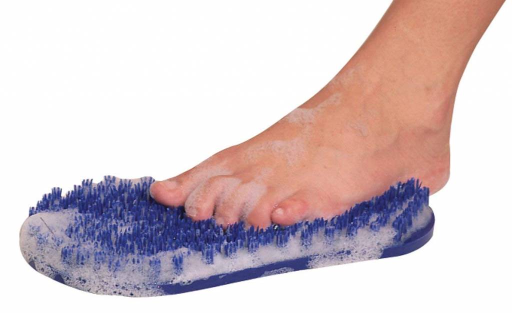 Solution originale pour les personnes ayant des difficultés ou n'ayant pas accès à leurs pieds. Les pieds sont poussés d'avant en arrière sur le tapis à brosses. Le lave-pieds se fixe au sol ou dans la baignoire à l'aide de ventouses. Principalement destiné à la plante des pieds.