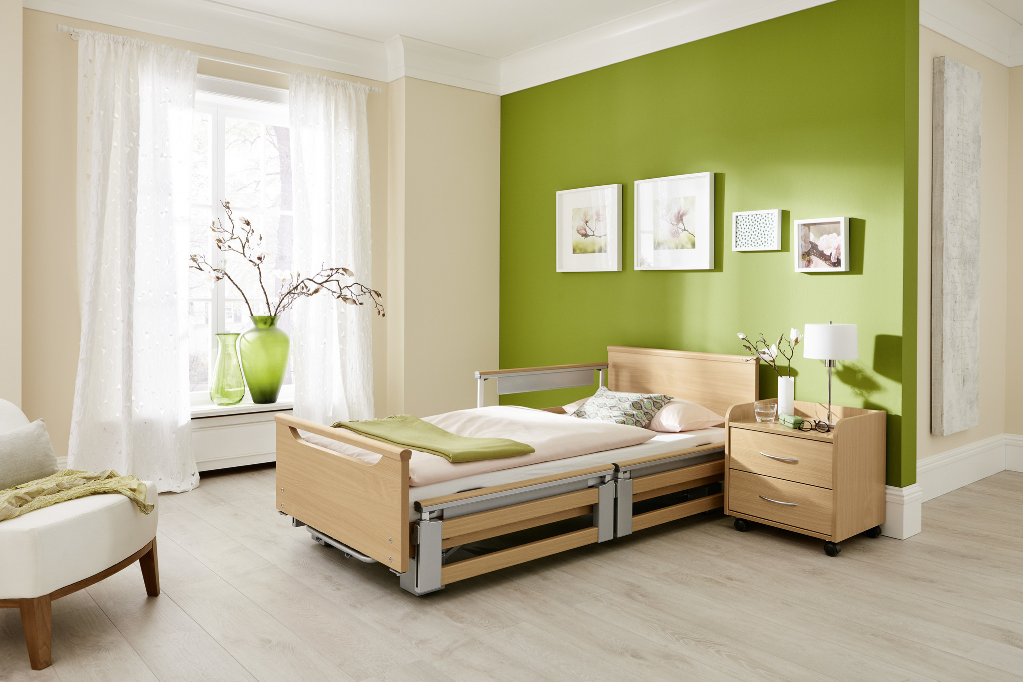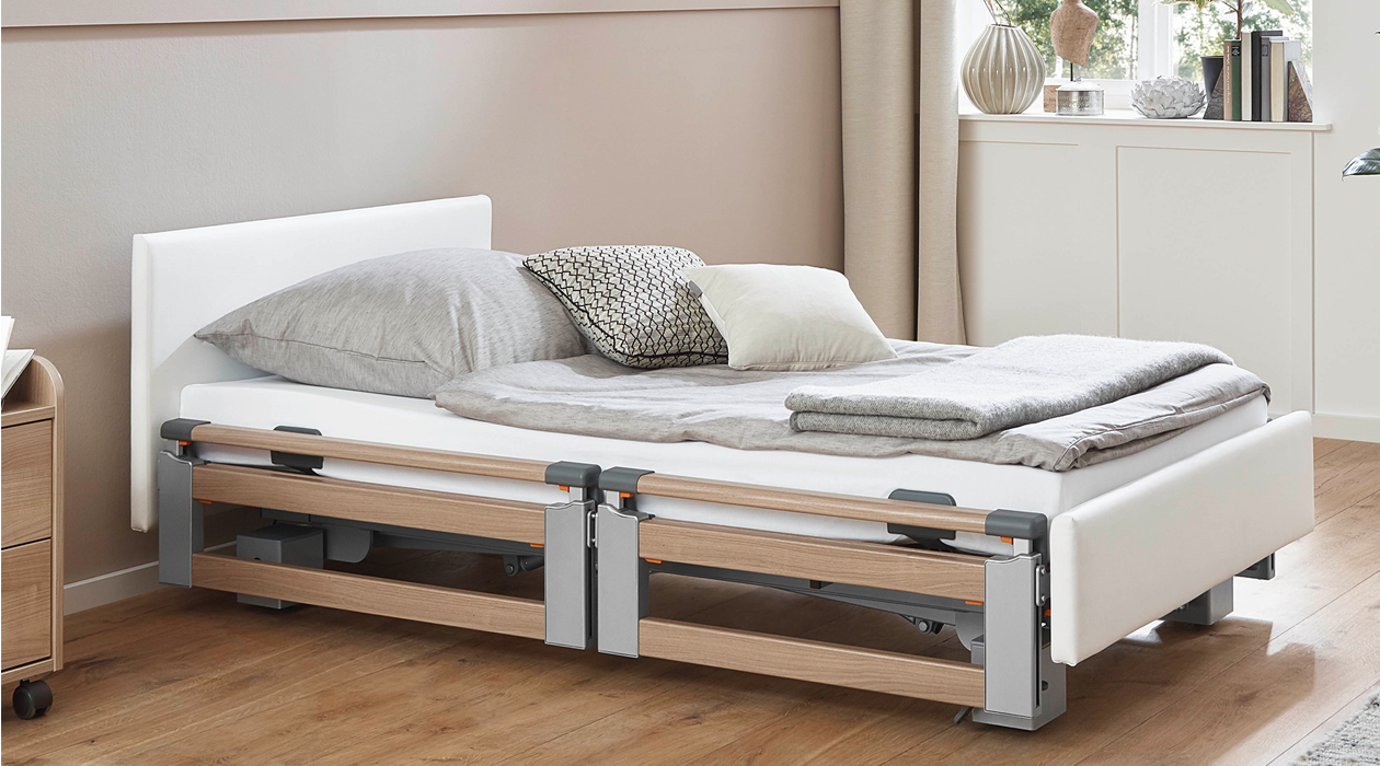 Le Regia est un lit surbaissé qui protège les résidents des chutes dangereuses avec une hauteur de surface de couchage de seulement 26 cm . À la position la plus haute de 80 cm, les infirmières peuvent travailler confortablement. Lors du réglage, le lit insère automatiquement une butée pratique à la hauteur d'entrée et de sortie pratique de 38 cm.