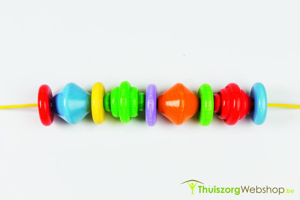 Très grosses perles, disques et cônes en bois (± 5 cm) avec un trou de 0,5 cm de diamètre. Cela fournit un exercice d'enfilage qui est également possible pour les doigts moins adroits .