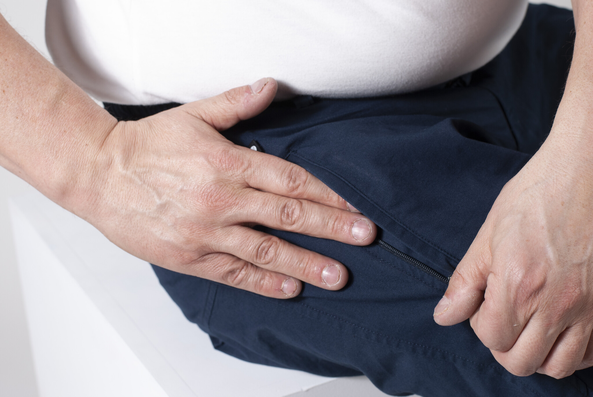 Pantalon classique et élégant pour les utilisateurs de fauteuils roulants. Le pantalon est plus haut dans le dos et plus bas sur le ventre.