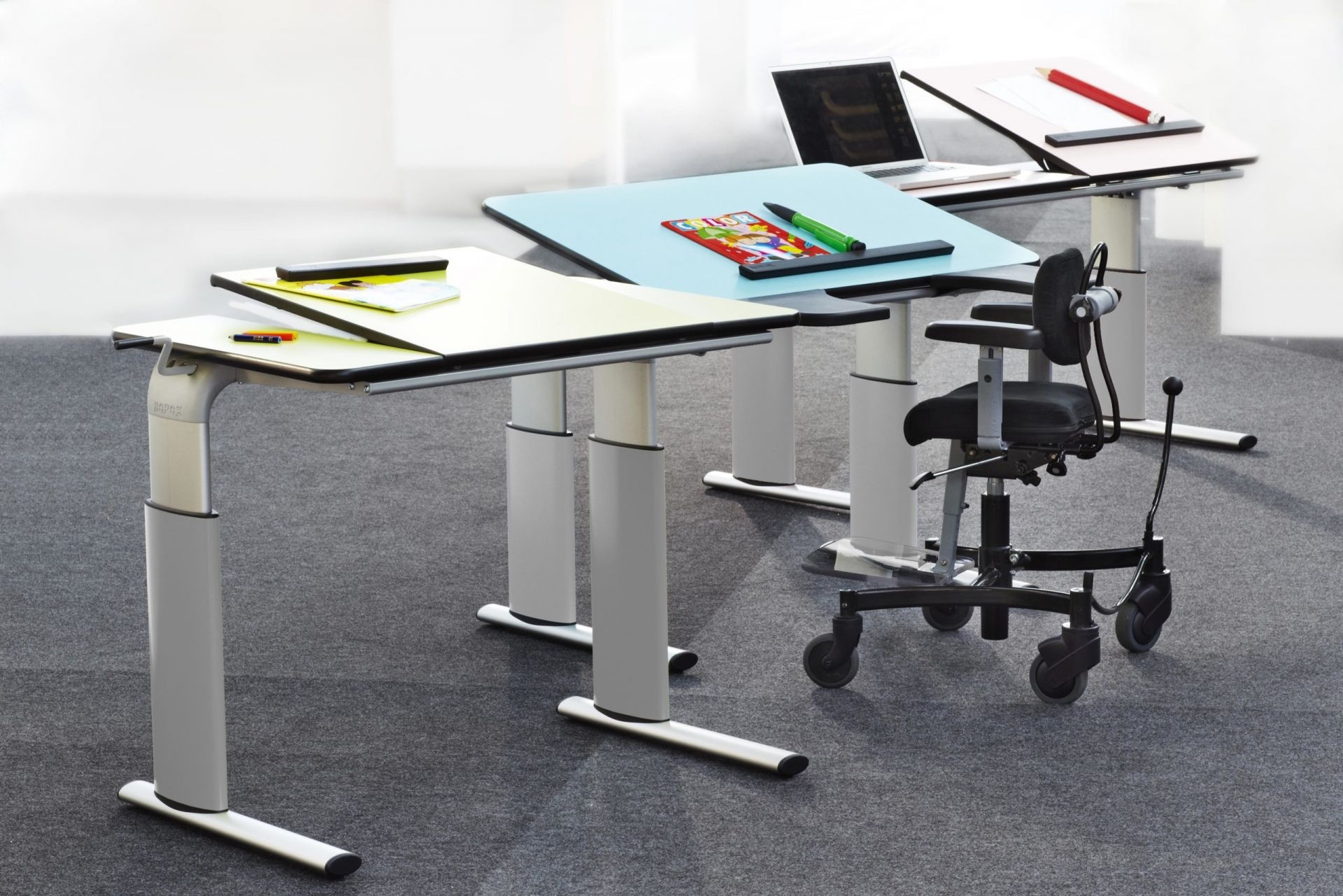 Un plateau de table inclinable rend la table plus accessible aux personnes ayant une déficience visuelle ou une fonction réduite des bras. Ce type est équipé d'une plaque d'acier intégrée pour l'utilisation d'aimants. Les tables de groupe n'ont qu'un plateau fixe. Différentes dimensions et réglages de hauteur sont possibles. Disponible en version électrique sur demande.