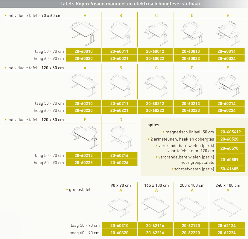 Disponible en table individuelle ou en table de groupe. Les tables individuelles peuvent être équipées d'un plateau fixe ou d'un plateau entièrement ou partiellement inclinable.