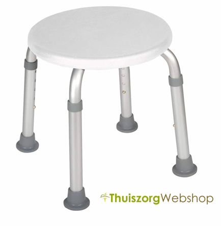 Chaise de douche légère en aluminium avec siège rond et siège en plastique. Equipé de pieds antidérapants robustes.