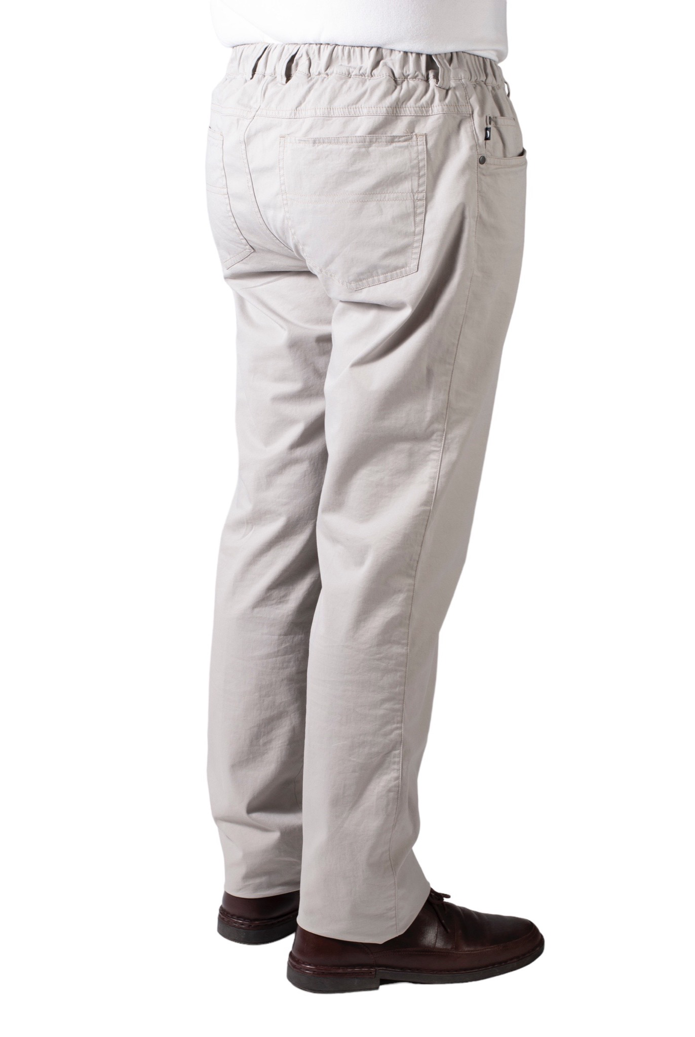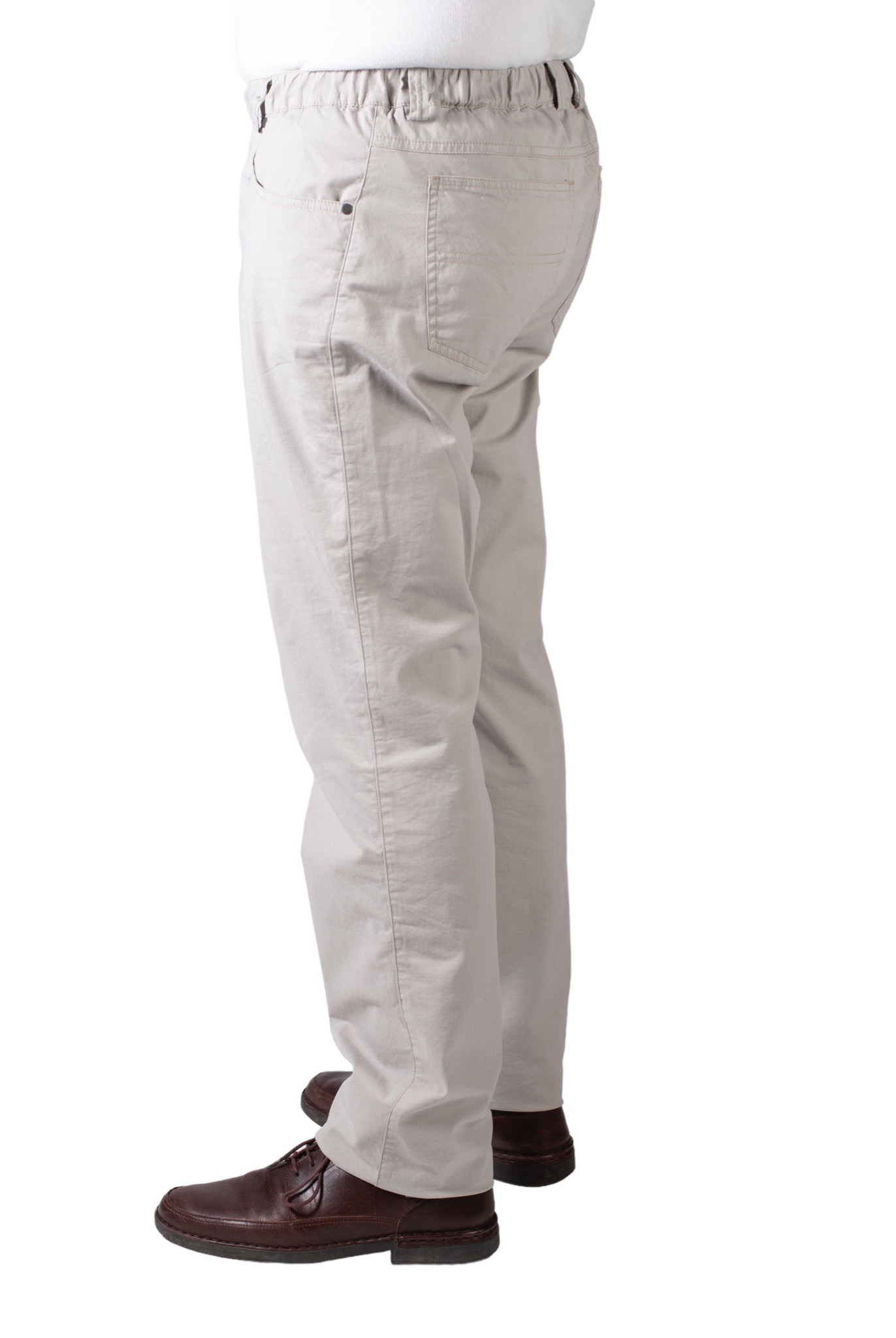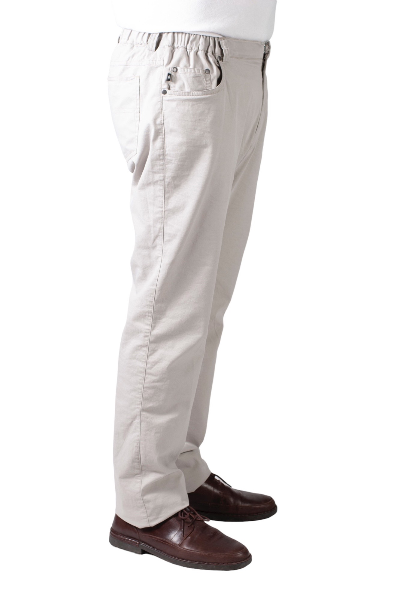 Modieuze 5 pocket broek in zachte katoen met elastische tailleband, haak en oog sluiting en rits. De broek kan zonder het openen van de sluiting aangedaan worden, waardoor dit model uitermate geschikt is voor personen met fijnmotorische beperkingen of voor eenhandig gebruik.Dankzij de knoop en rits kan het toiletbezoek gemakkelijk verlopen.