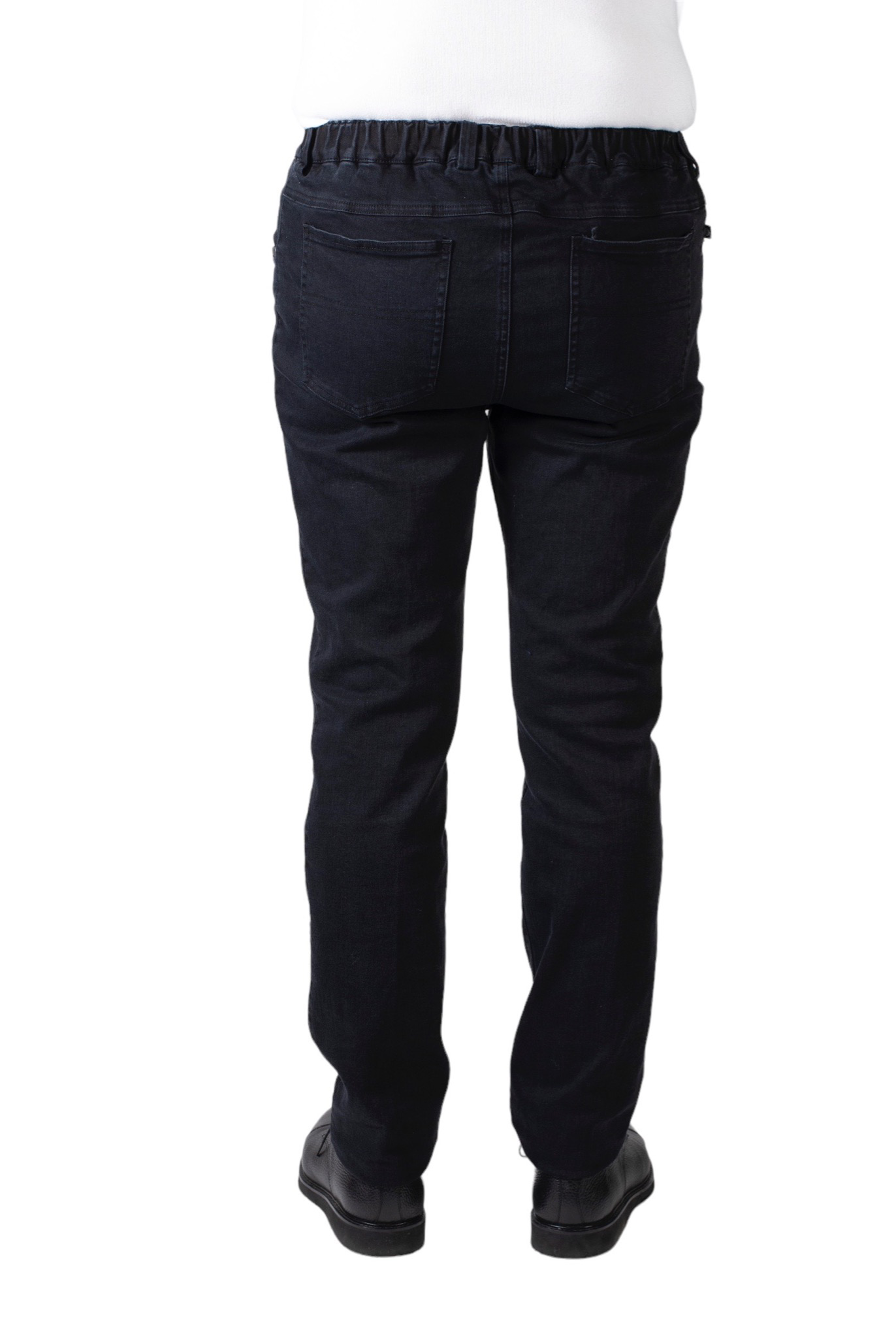 Modieuze 5 pocket broek in zachte stretchjeans met elastische tailleband en haak en oogsluiting. De broek kan zonder het openen van de haak en oogsluiting aangedaan worden, waardoor dit model uitermate geschikt is voor personen met fijnmotorische beperkingen of voor eenhandig gebruik.Dankzij de knoop en rits kan het toiletbezoek gemakkelijk verlopen.