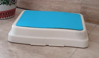 Stapelbare badopstap met antislip comfortlaag. Hoogte van één element is ± 10 cm, vervolgens telkens 5 cm verhoging, doordat elk element 5 cm over het volgende schuift. Alle elementen zijn gelijk. Bv. men wenst ± 20 cm te verhogen: 3 elementen volstaan (10 + 5 + 5 cm).