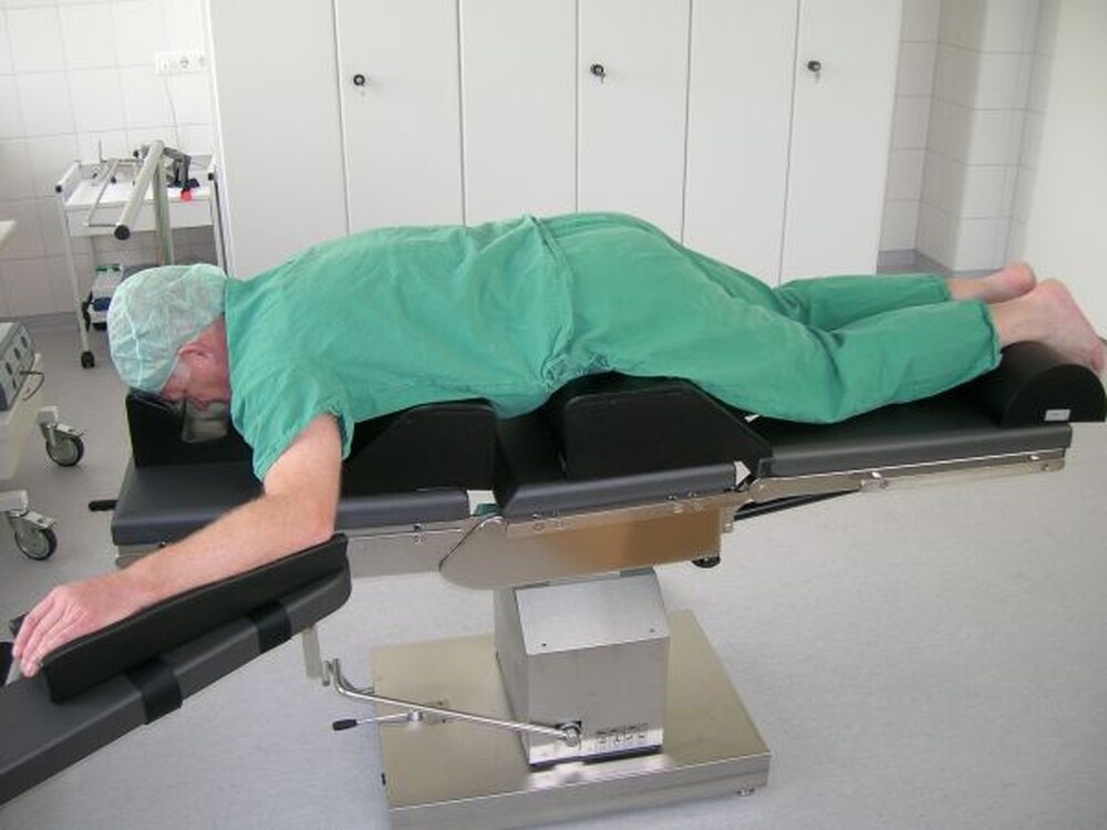 Het bekkenkussen bevat eveneens een uitsparing ter hoogte van het bekken. Het loopt aan de onderzijde echter schuin af onder een hoek van 45° om de liesstreek te ontlasten. Onderaan heeft dit kussen eveneens een uitsparing ter ontlasting van de genitaliën. Vervaardigd uit hardschuim, vrij van materiaalmoeheid. De variant met waterdichte PU coating is voorzien van een visco-elastische laag en met afgeronde kanten waardoor het gevaar voor drukbeschadiging tot een minimum herleid wordt. Dit bekkenkussen gecombineerd met het thoraxkussen maakt het mogelijk om het lichaam optimaal te positioneren en aan te passen aan de lichaamsgrootte, waardoor de buikademhaling niet verstoord wordt.