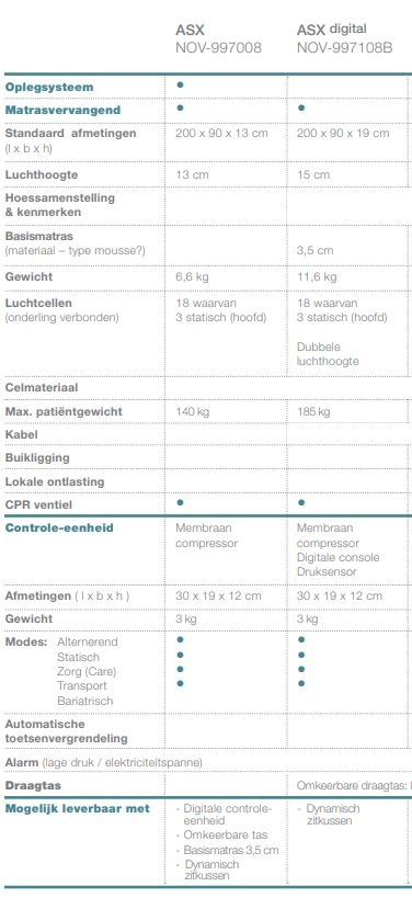 Het basismodel, de novacare ASX, is ontworpen voor een patiënt tot 140 kg en wordt gebruikt als oplegmatras of matrasvervanger. Dit systeem bestaat uit 18 PU-gecoate nyloncellen. De drie statische hoofdcellen bieden de patiënt het vereiste comfort.