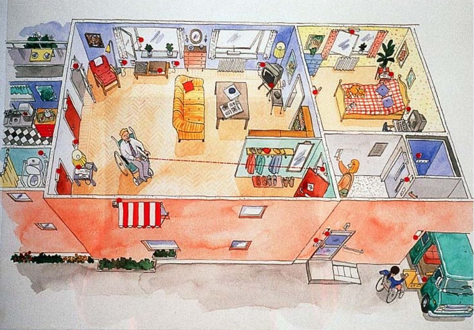 De omgevingsbediening geeft mensen met zware beperking vb. tetraplegie, de mogelijkheid om hun omgeving zelfstandig te controleren. De rode stippen op de tekening hiernaast geven een idee van de