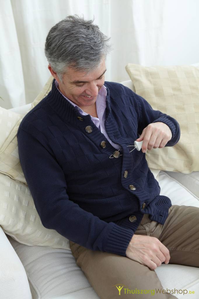 Dit hulpmiddel helpt om eenhandig knopen te sluiten. Bvb bij hemiplegie maar ook bij een slechte fijne motoriek. |