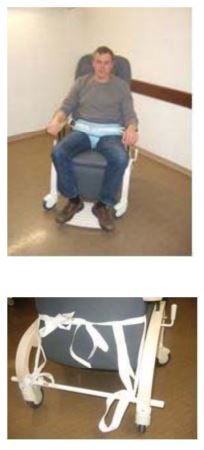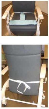 -> Plaatsing gordel in zetel. Linten achteraan bevestigen vooraleer de patiënt gaat zitten. Bevestig de linten aan achterkant zetel.