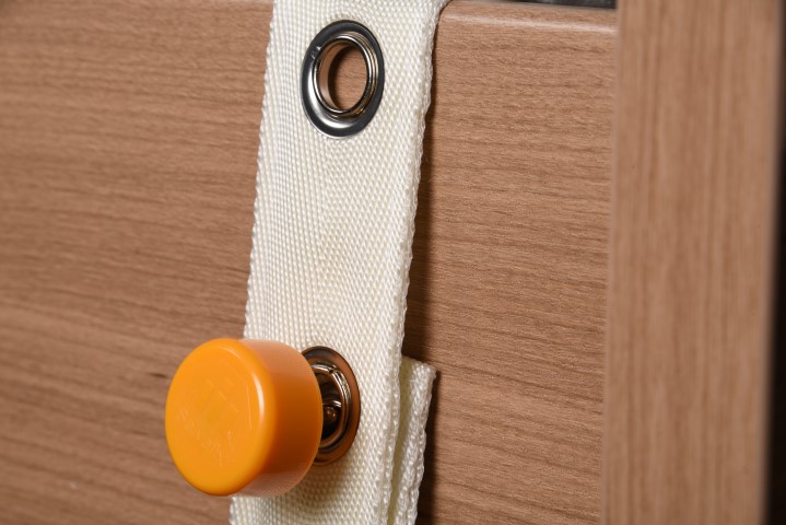 De scheurarme slaapzak is standaard voorzien met 3 bevestigingsriemen, één aan de schouders, één aan de lenden en één aan het voeteneinde. De riemen zijn voorzien van luchtringen waardoor magneetsloten kunnen aangebracht worden ter bevestiging aan het frame van het bed.