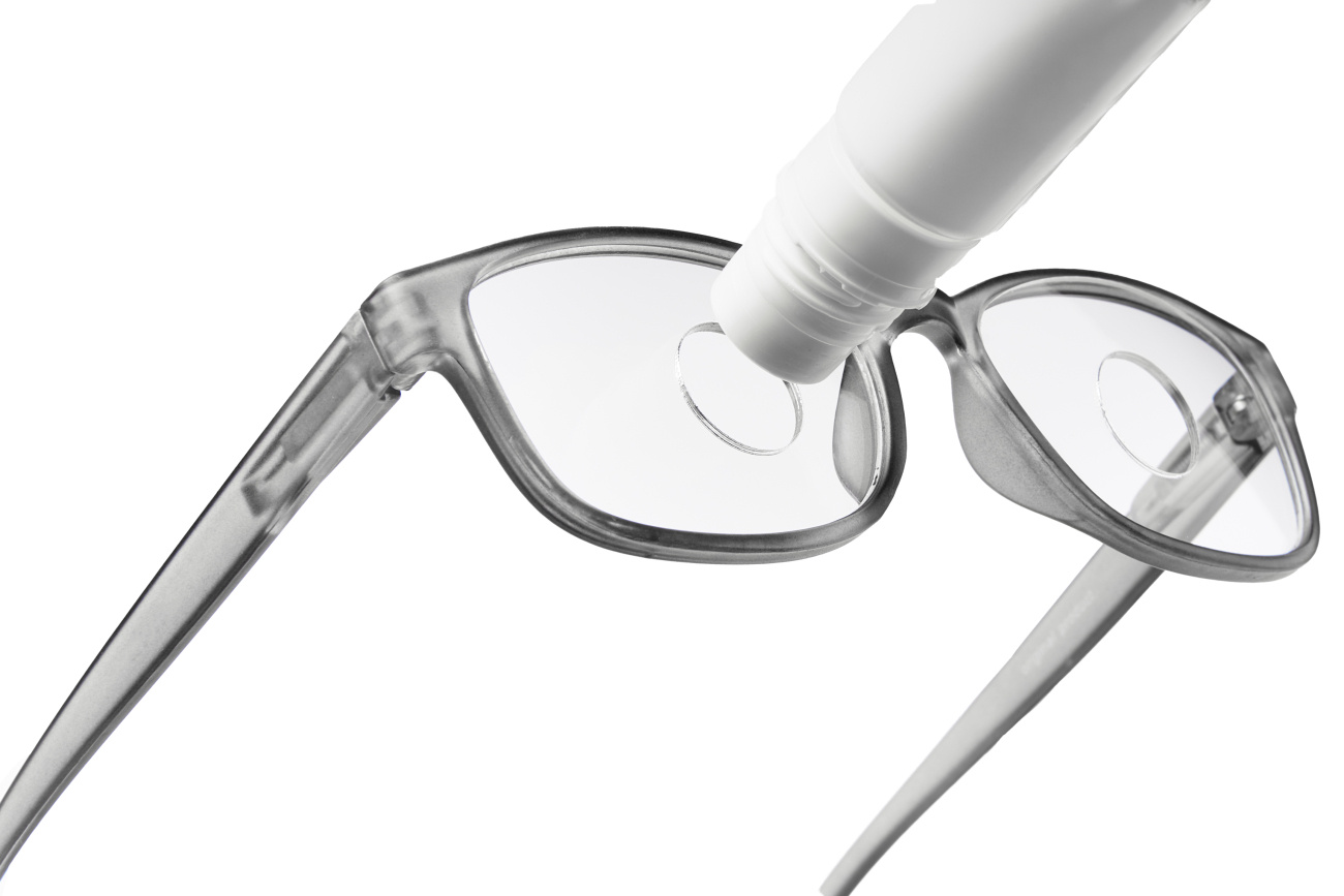 2. Druppelbril met 1 opening: Druppelbril voor het toedienen van oogdruppels in een flacon na een staaroperatie. De richtlijn voor staaroperaties is aangepast. Er worden na de operatie andere oogdruppels voorgeschreven dan voorheen, in een nieuw soort druppelflacon. Deze flacon past niet op de originele druppelbril. Vandaar dat een nieuwe druppelbril werd ontwikkeld, waar deze flacon wel op past. Hierdoor is het toedienen van oogdruppels zeer eenvoudig.