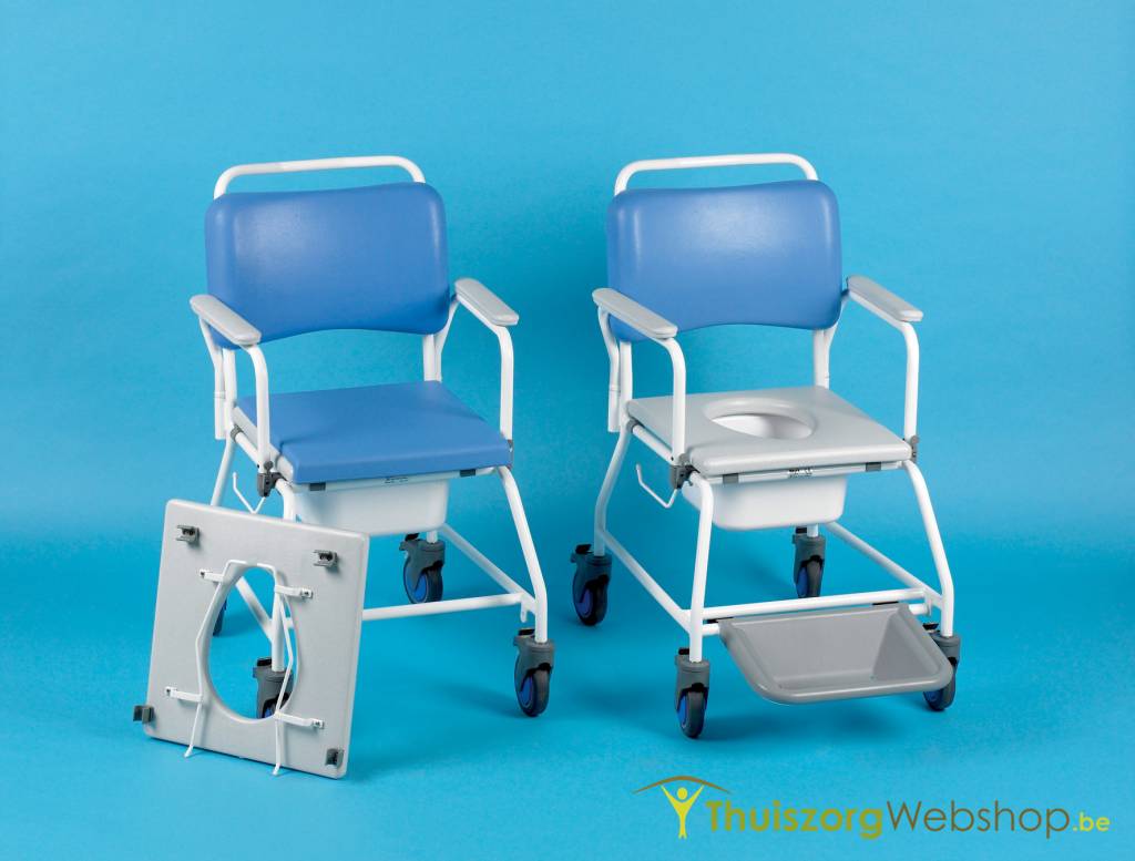 Douche- en toiletstoelcombinatie, volledig geconcipieerd tegen roestvorming en gemakkelijk uit elkaar te nemen. Het frame is gemaakt uit staal met een plastic laag. De armleuningen zijn wegklapbaar voor gemakkelijke transfers en ook de zitting kan gemakkelijk weggenomen worden. Standaard worden een grote vierkante witte toiletemmer en zitkussen meegeleverd.
