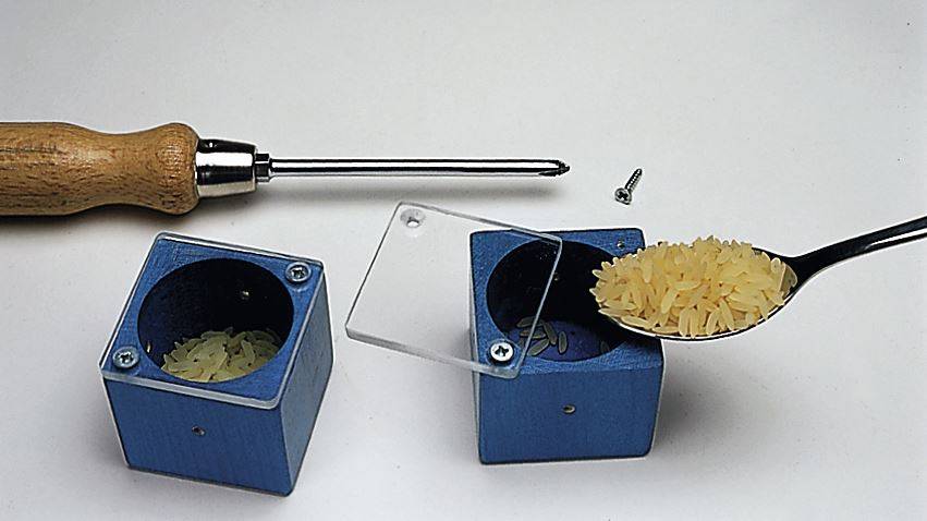 Kubusjes in paren gevuld met voorwerpen die geluid maken stimuleren de auditieve perceptie en ook de taalontwikkeling en vormherkenning. Sommige geluiden klinken heel gelijk dus wordt de concentratie op de proef gesteld. De bovenkant heeft een doorzichtig deksel van plexiglas ter controle maar het kan ook geopend worden met een schroevendraaier om de voorwerpen te vervangen door andere. Het kan gebruikt worden als memoryspel maar bv. ook om in groep de deelnemer met het gelijke kubusje te vinden.