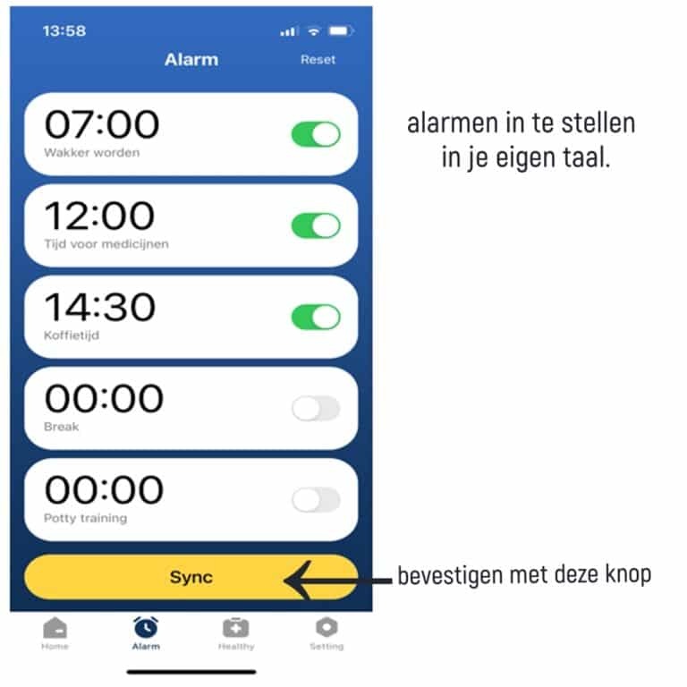 - Aangepaste Alarmmeldingen: Stel tot 8 alarmen in en beschrijf de alarmen in je eigen taal om herinneringen te ontvangen die écht aansluiten bij jouw leven.