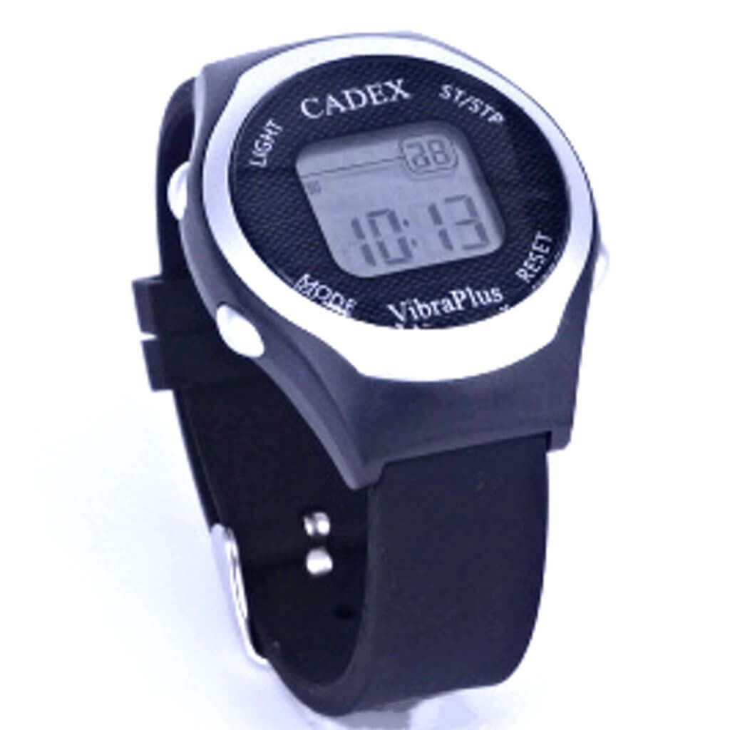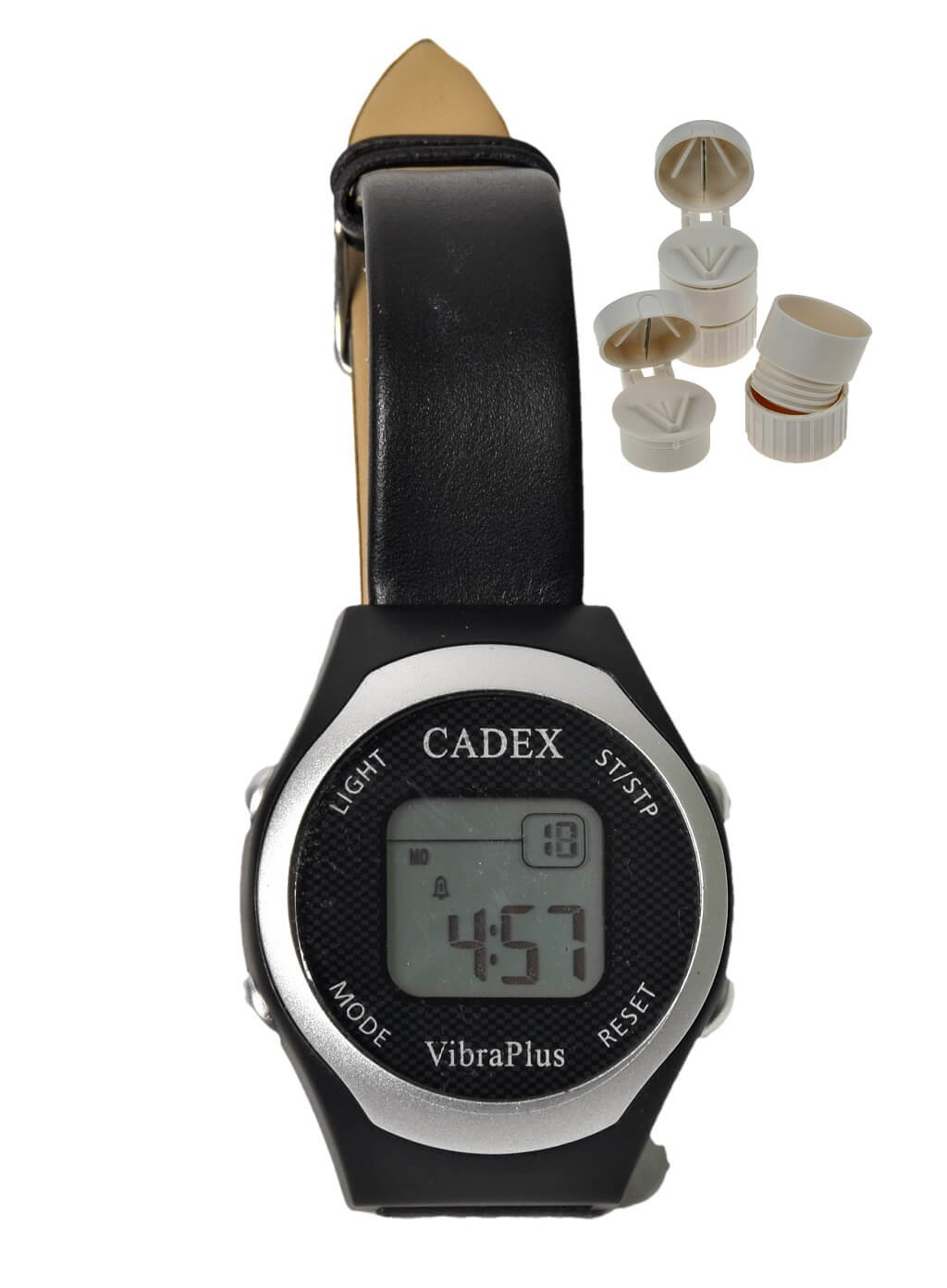 De vibra plus van Cadex is een handig medicijnhorloge met een luxe uitstraling. Het horloge is voorzien van een leren polsband voor polsen van 16 tot 20 cm. De 8 dagelijks instelbare alarmen helpen bij het op tijd innemen van medicijnen. Qua alarmsignaal kan er gekozen worden voor een geluid en/of een trilsignaal voor een discrete alarmering. Met één druk op de knop gaat de achtergrondverlichting aan waardoor het horloge ook in het donker afleesbaar is.