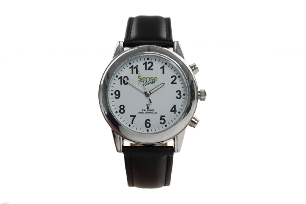 SenseWorks Nederlandssprekend horloge gemaakt van metaal met een witte analoge wijzerplaat met witte fluoriserende wijzers en 12 zwarte cijfers. Met keuze voor tijd- en alarmuitspraak in 12 of 24 uursklok, bijvoorbeeld: "De tijd is vijf over twaalf in de middag". Inclusief mogelijk tot het instellen van een alarm. Functies zoals tijd, alarm, dag en datum worden met zeer professionele stem geheel uitgesproken.