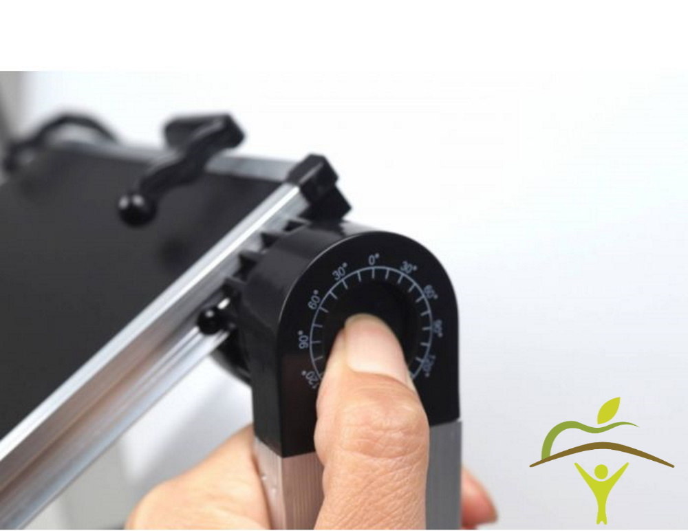 Door de knop t.h.v. van de scharnierpunten in te drukken en te draaien kan de houder in elke gewenste positie ingesteld worden. Op de knoppen staan gradaties vermeld.