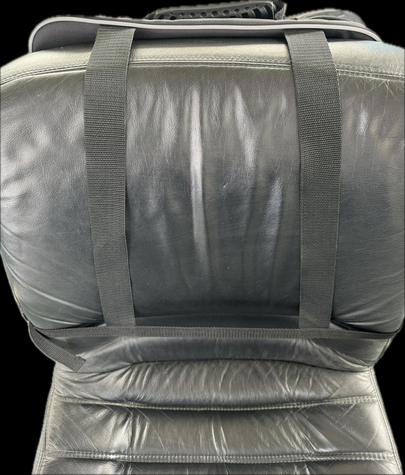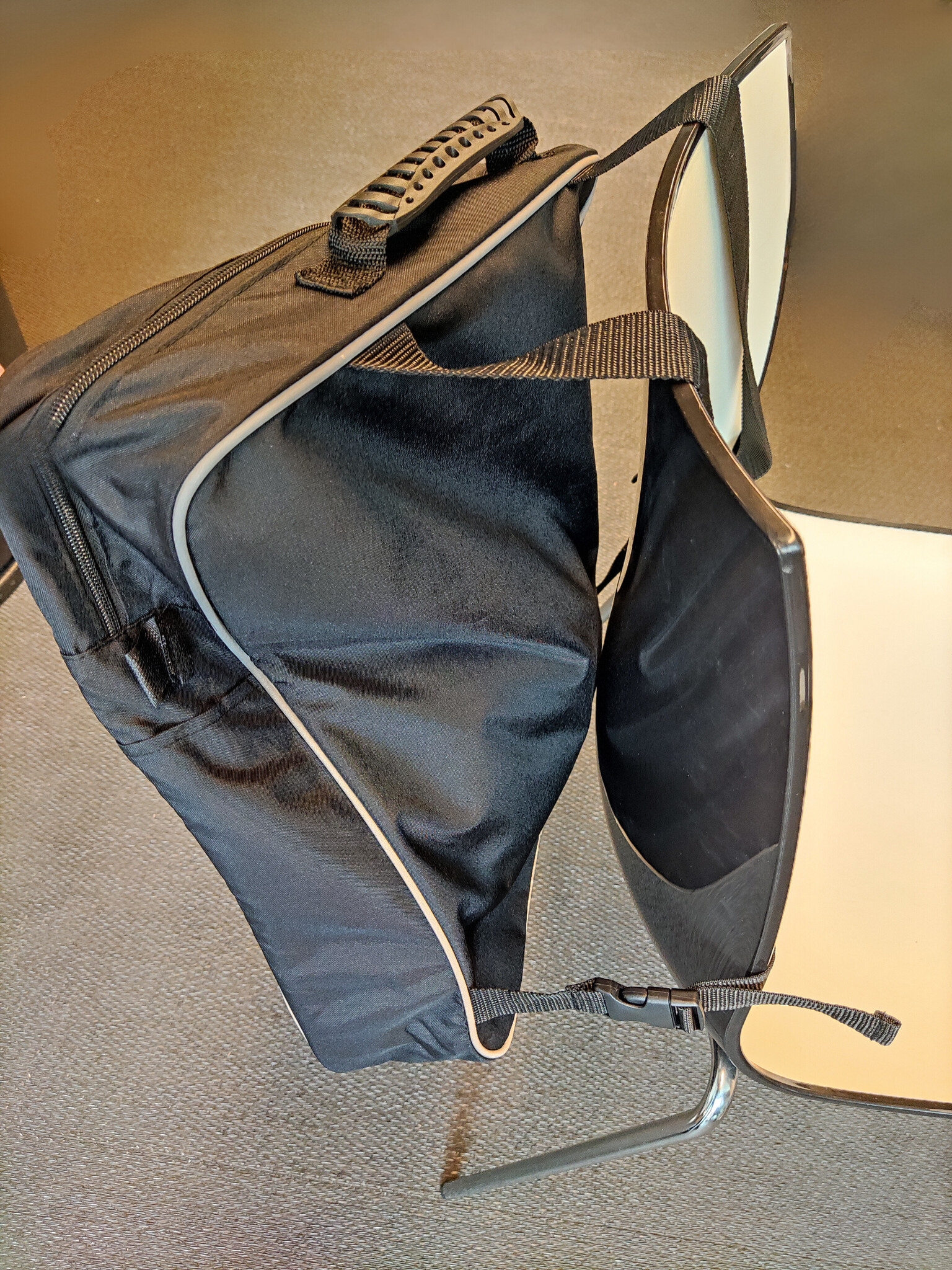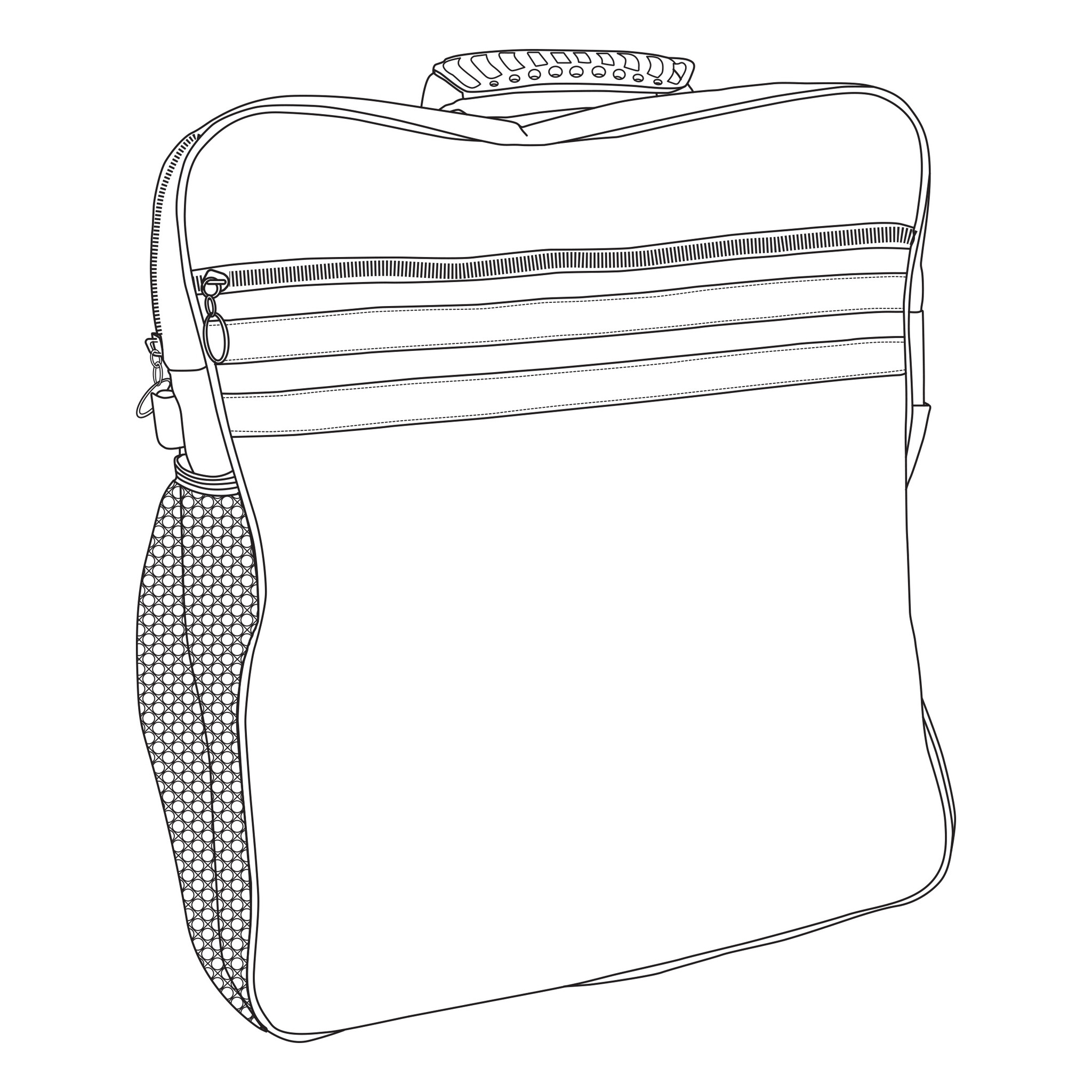 De tas is waterbestendig en heeft verhoogde rubberen voetjes op de bodem om de bodem van de tas droog te houden wanneer deze op de vloer rust. Er zit een stevig handvat aan de bovenkant van de tas en verstelbare riemen met gespen voor een veilige bevestiging aan de achterkant.