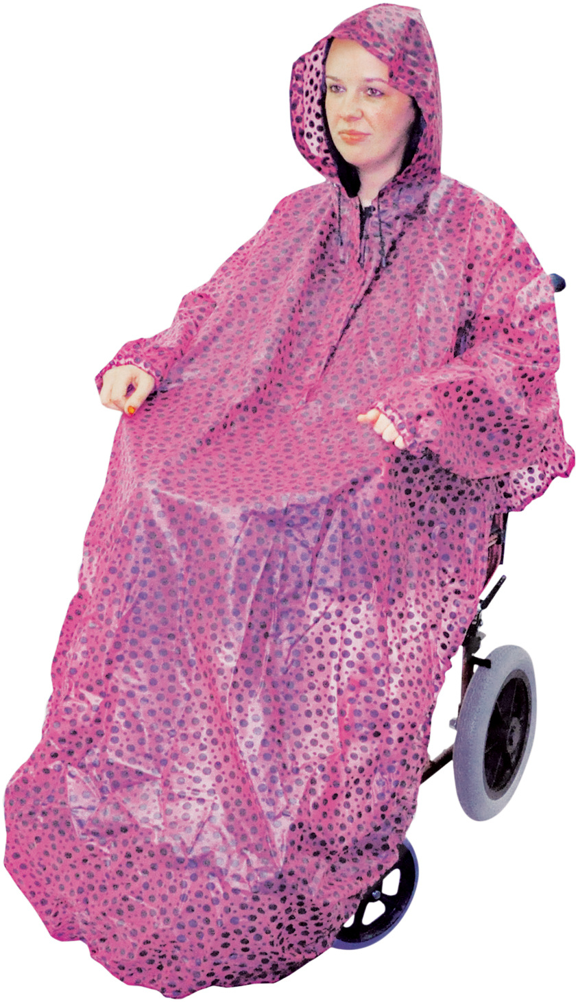 De poncho met Mouwen is het ideale kledingstuk om u en uw rolstoel van top tot teen te beschermen, met zachte elastische manchetten aan de mouwen om ervoor te zorgen dat er geen schuren op de huid ontstaat, een ritssluiting aan de halslijn zodat de poncho kan worden aangetrokken of gemakkelijk uit te trekken, plus een elastische rok voor een goede pasvorm en een capuchon met trekkoord en veerclipsluiting. Het perfecte rolstoelaccessoire/kledingstuk voor rolstoelgebruikers die een hoge mate van onafhankelijkheid vereisen en hun rolstoel zelf willen voortbewegen; de poncho met Mouwen is gemaakt van 100% waterdichte stof en biedt volledige bescherming tegen de elementen. Met sleuven aan de achterkant voor duwhandvatten. Verkrijgbaar in het blauwe of roze stippenontwerp. Geschikt voor machinaal wassen op lage temperatuur.