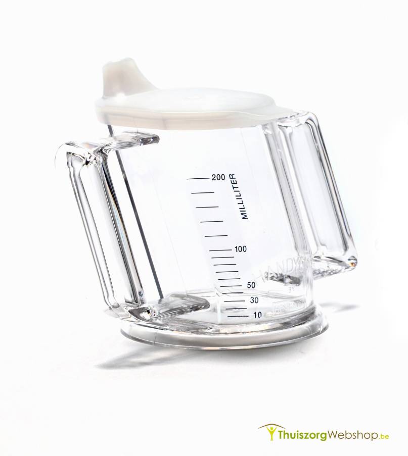 - Transparant zodat steeds duidelijk is hoeveel vloeistof er in de Handycup® zit 2 tuitjes inbegrepen: opening van 4 mm voor dranken en 8 mm voor o.a. soep en yoghurt