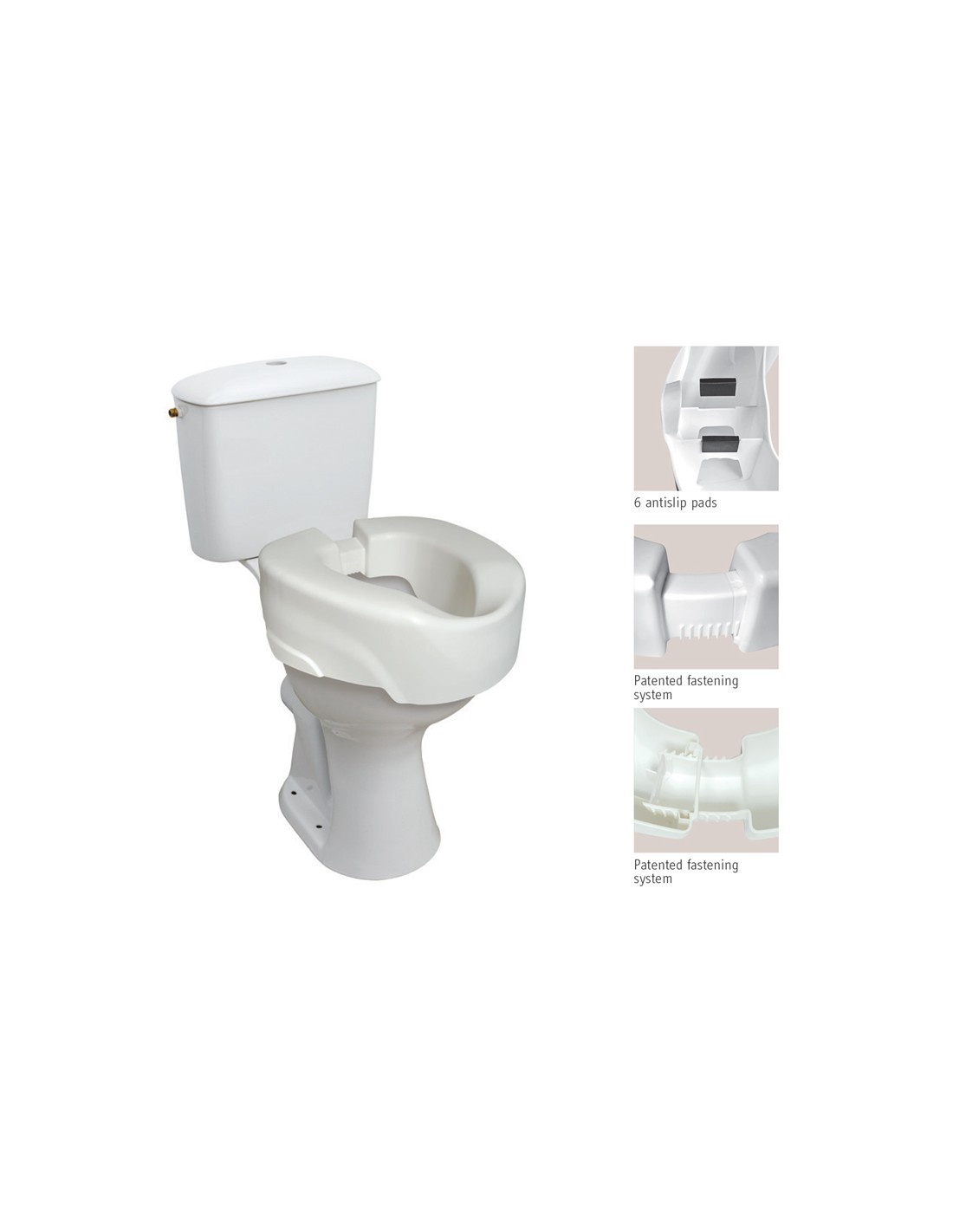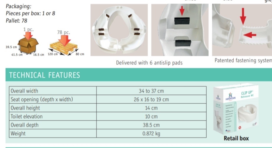 De toiletverhoger ClipUp komt in de plaats van de bestaande toiletbril en wordt eenvoudig op de toiletrand vast geklikt. Hij is hoefijzervormig en verhoogt de zitting met 10 cm. Hierdoor heeft hij hetzelfde effect als een klassieke toiletverhoger van 10 cm.