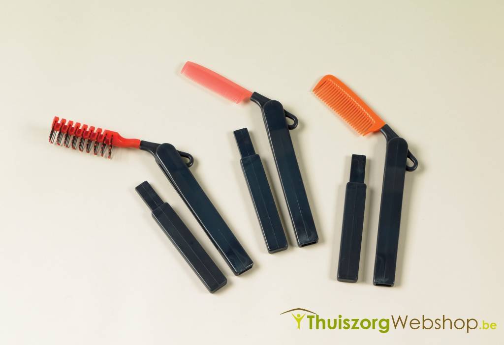 De kam of borstel kan in 2 hoeken ingesteld worden en na gebruik in het handvat geplooid worden. Kan zowel door links- als rechtshandigen gebruikt worden.