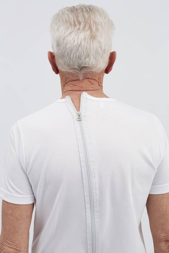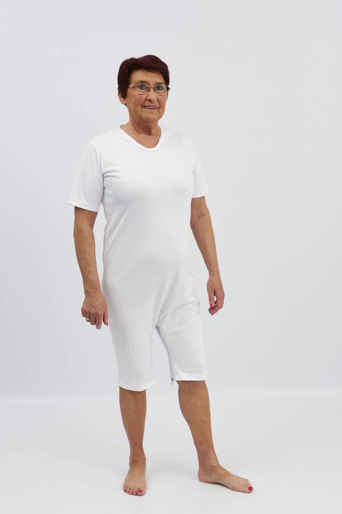De zorg-body met korte mouwen verenigt onderhemd en fixeerbroek in een product. Deze fixeerbody kan probleemloos en makkelijk als normaal ondergoed worden gedragen. De ritsoplossing tussen de benen en op de rug vereenvoudigt de gang naar de toilet. In de zorg vereenvoudigt de zorg-body de hygiënische wisseling van incontinentieproducten, zonder dat een compleet ontkleden nodig is. De uit de katoen en polyester vervaardigde fixeerbody is warm en draagt zich aangenaam op de huid. De zorgbody is geschikt voor mannen en vrouwen.